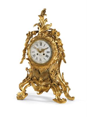 PENDOLA Pendola in bronzo dorato stile Luigi XV, epoca Napoleone III H 62 Cassa in bronzo dorato, quadrante in smalto con doppia numerazione romana ed araba firmato "Musy père et Fils à Torino", movimento parigino con suoneria delle ore e delle mezze su gong. A Louis XV style bronze clock