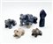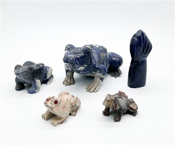 Lotto composto da quattro figure di rana in sodalite e altri marmi e figura di una mano stilizzata (cm max 21x14) (difetti e piccole mancanze)