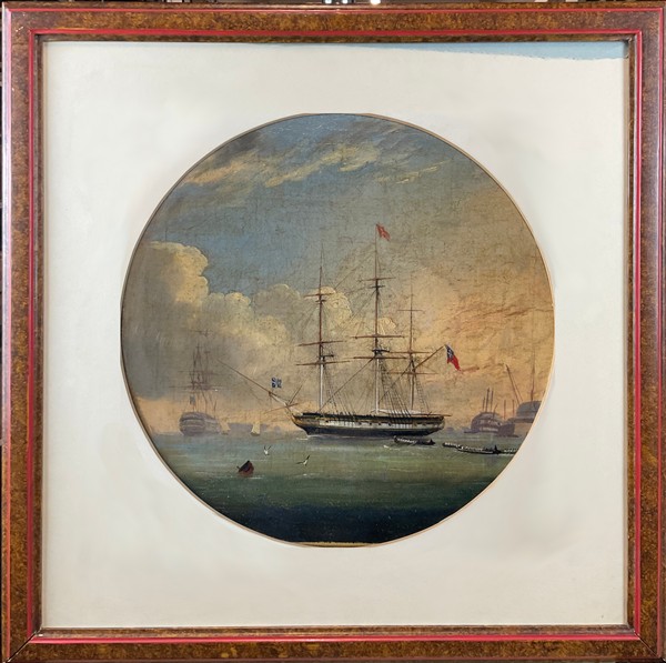 Scuola del secolo XIX "Veliero" olio su tela (cm d. 43) in cornice (difetti)