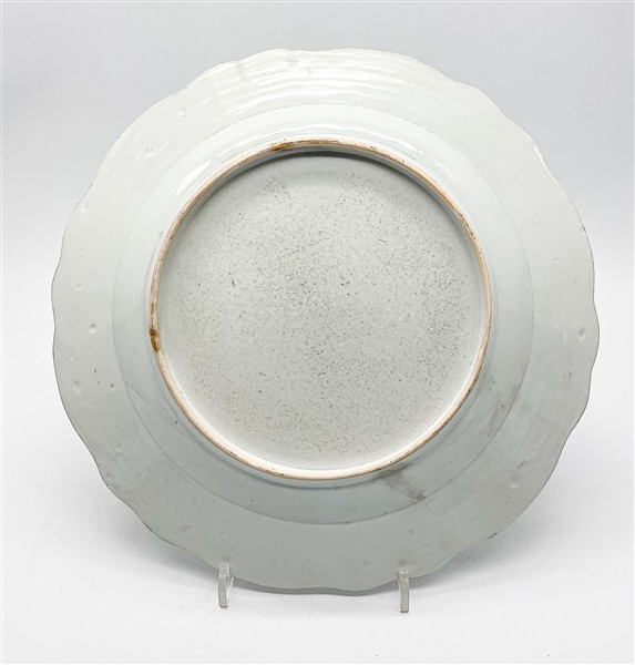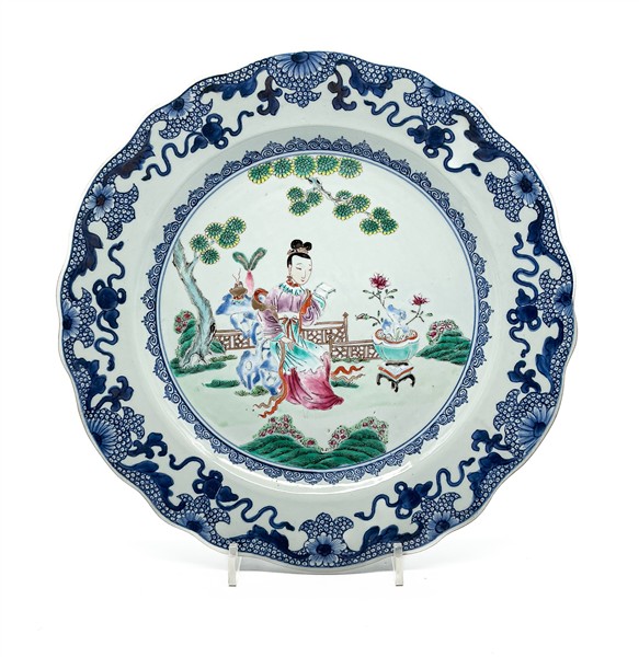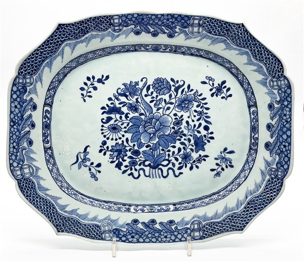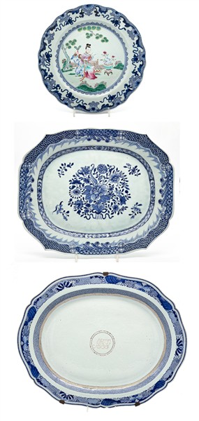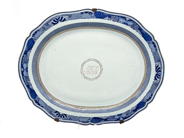 Lotto composto da grande piatto da portata ovale con monogramma dorato nel cavetto, vassoio ovale e grande piatto a profilo mistilineo. Manifattura della Compagnia delle Indie, Cina, secolo XVIII (cm max 66x55) (difetti e sbeccature)