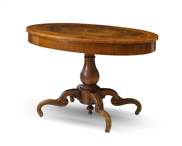 Tavolino da centro lastronato in noce e radica di noce con piano ovale, fusto tornito su gambe sagomate (cm 120x76x70) (difetti)