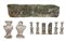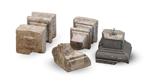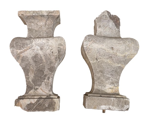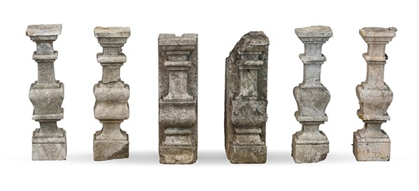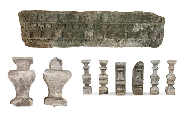 Lotto composto da un antico fregio architettonico in marmo scolpito a ovoli e motivi stilizzati (cm max 98x25) e numerosi pilastrini da balaustra in marmi e altri materiali (difetti, mancanze e rotture)