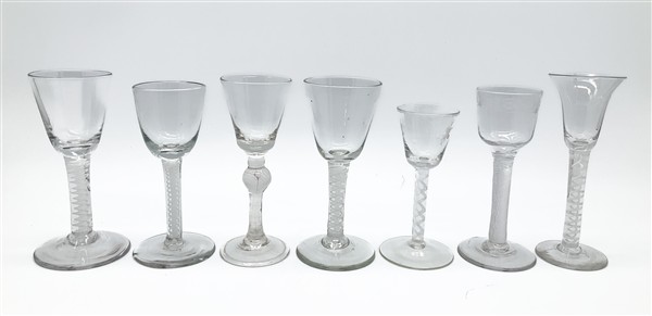 Manifatture diverse, secolo XVIII. Gruppo di sette calici in vetro soffiato con stelo decorato da spirale sommersa, due con decori incisi (h max cm 16,5) (lievi difetti)