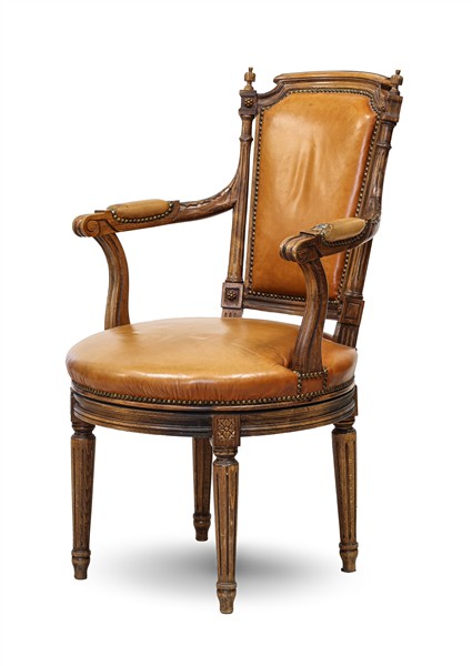 Poltrona girevole in stile Luigi XVI in legno intagliato con braccioli terminanti a ricciolo e gambe scanalate, seduta e schienale rivestiti in pelle borchiata (difetti)