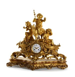 PENDOLA Pendola da camino in bronzo dorato, Francia epoca Napoleone III H 60 60x30 cm Cassa in bronzo dorato sormontata da putti festanti, quadrante in smalto con doppia numerazione romana ed araba firmato Boussard e Massol a Toulouse, movimento parigino con suoneria delle ore e delle mezze su campanello. A French Napoleon II bronze clock
