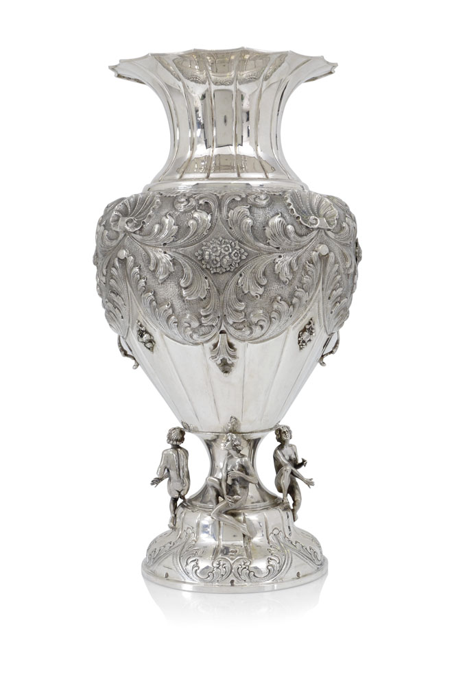GRANDE VASO IN ARGENTO, MILANO, ANNI '70, a balaustro sbalzato a ramage di foglie e conchiglie, sostegno con quattro figure femminili.