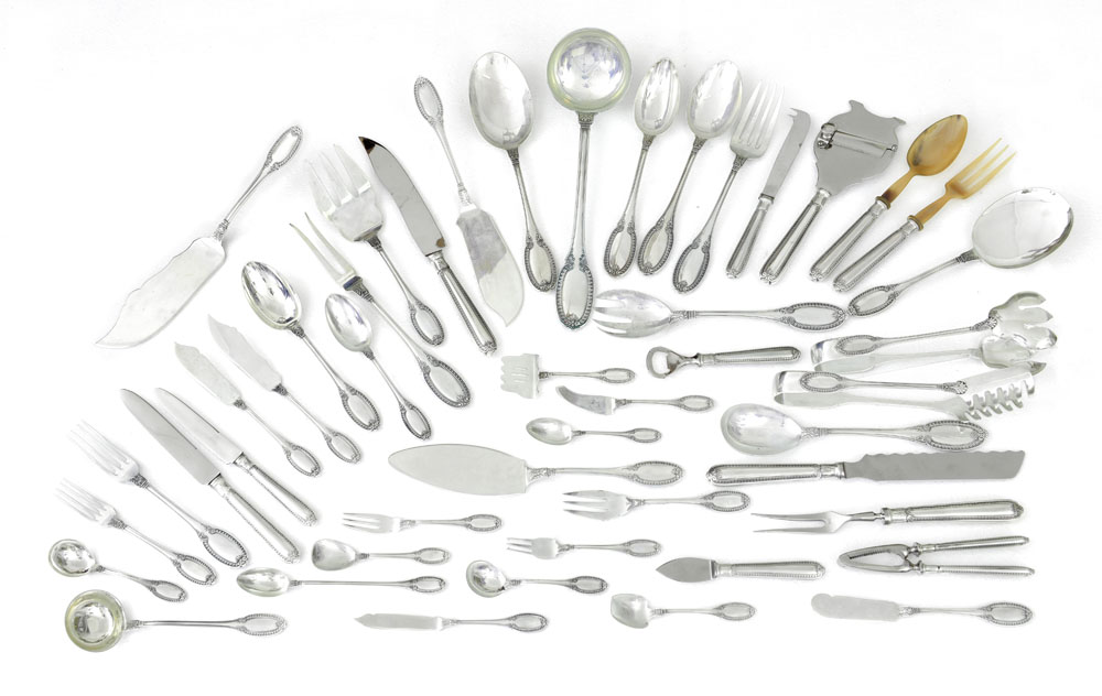 SERVIZIO DI POSATE IN ARGENTO, BOLOGNA, CLEMENTI, XX SECOLO, decoro in stile Impero con bordi a foglie lanceolate, composto da ventiquattro forchette e coltelli, dodici cucchiai, dodici forchette e coltelli da pesce, ventiquattro forchette e coltelli da frutta, dodici cucchiai da frutta, dodici forchette e coltelli da dessert, dodici cucchiaini da gelato, da caffé e da cocktail, un mestolo e trentacinque tra posate da portata e accessori; totale pezzi 240.