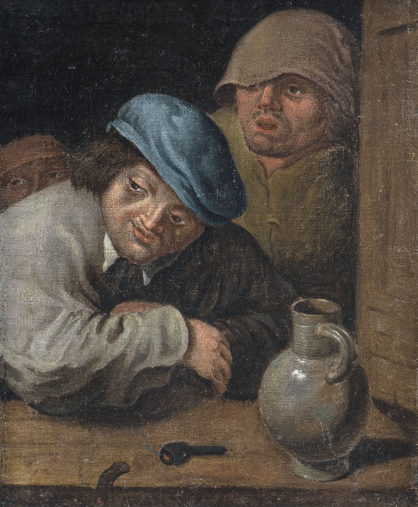 PITTORE FIAMMINGO DEL XVIII SECOLO Figure alla finestra con broccaOlio su...