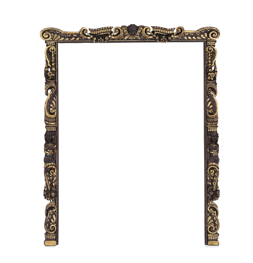 CORNICE A PORTALE SANSOVINA IN LEGNO SCOLPITO E DORATO, XVII SECOLO, decori a figure con putti e volute a ricciolo; restauri e mancanze.