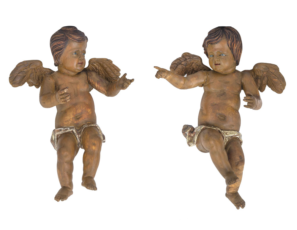 SCULTORE DEL XIX SECOLO Coppia di putti Legno scolpito e dipinto, alt cm 54 e...