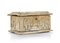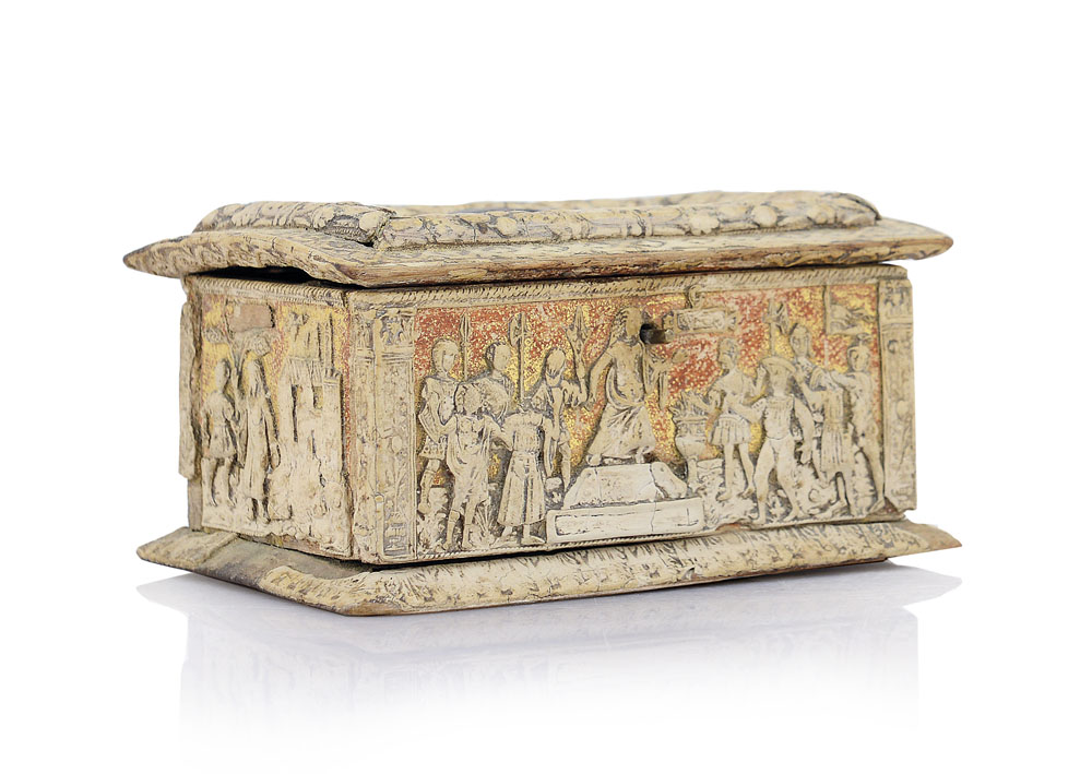 RARO COFANETTO DECORATO IN PASTIGLIA, FERRARA, META' XVI SECOLO, coperchio incernierato e decoro a rilievo con scene storiche su fondo oro; mancanze e usure.