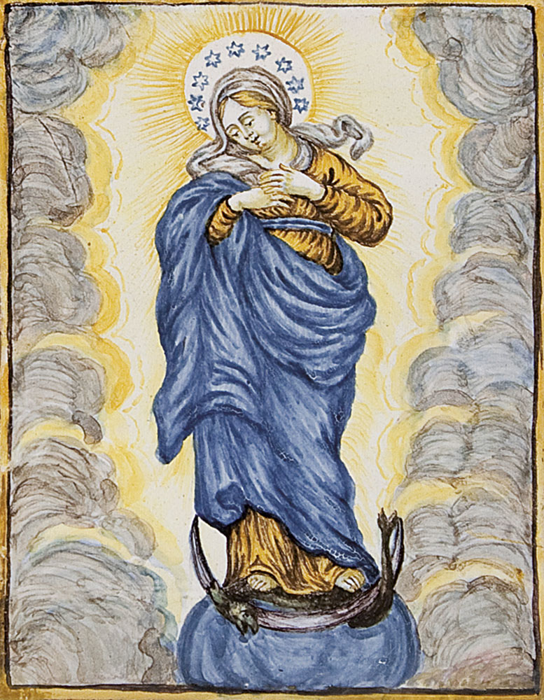 PLACCA IN MAIOLICA, CASTELLI, XVIII SECOLO, rettangolare con decoro policromo raffigurante l'Immacolata.