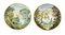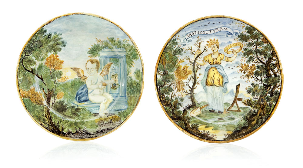 DUE PIATTELLI IN MAIOLICA, CASTELLI, XVIII SECOLO, decoro policromo, uno con figura allegorica entro paesaggio e cartiglio "Agricoltura" e uno con putto e ruderi entro paesaggio al tramonto, periodo Cappelletti; il secondo con restauro. Diam. cm 16,5.
