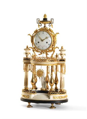 PENDOLA Pendola a portico in marmo e bronzo, Francia epoca Luigi XVI H 57 Cassa in marmo bianco di carrara e bronzi dorati, quadrante in smalto con numerazione romana firmato "Gaston Jolly à Paris" movimento parigino con suoneria delle ore e delle mezze su campanello, sospensione a filo, completa di chiave e pendolino a sole.