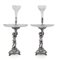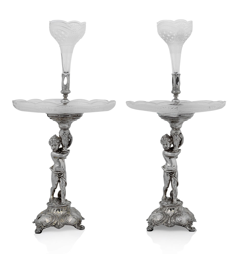COPPIA DI ALZATE IN METALLO ARGENTATO E CRISTALLO, INIZIO XX SECOLO, sostegni a putti su base rocaille, piatto e coppa superiore intagliati.