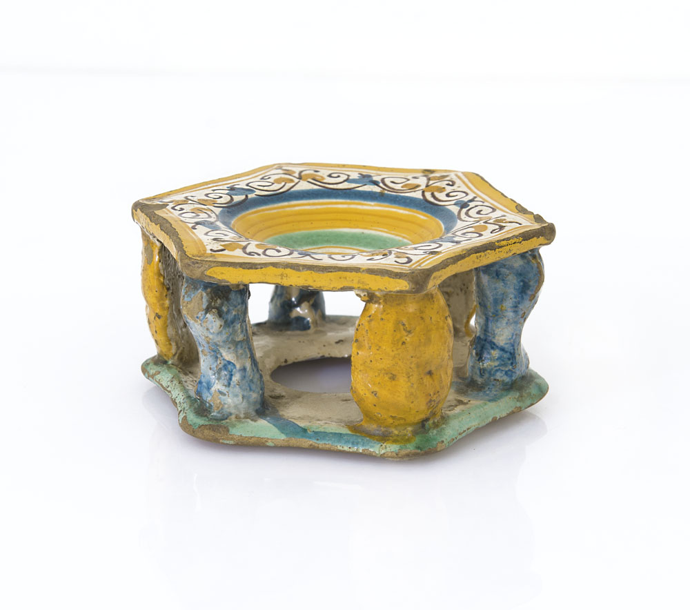 SALIERA IN MAIOLICA, XVII-XVIII SECOLO, esagonale con pilastrini, decoro policromo; restauri e sbeccature.