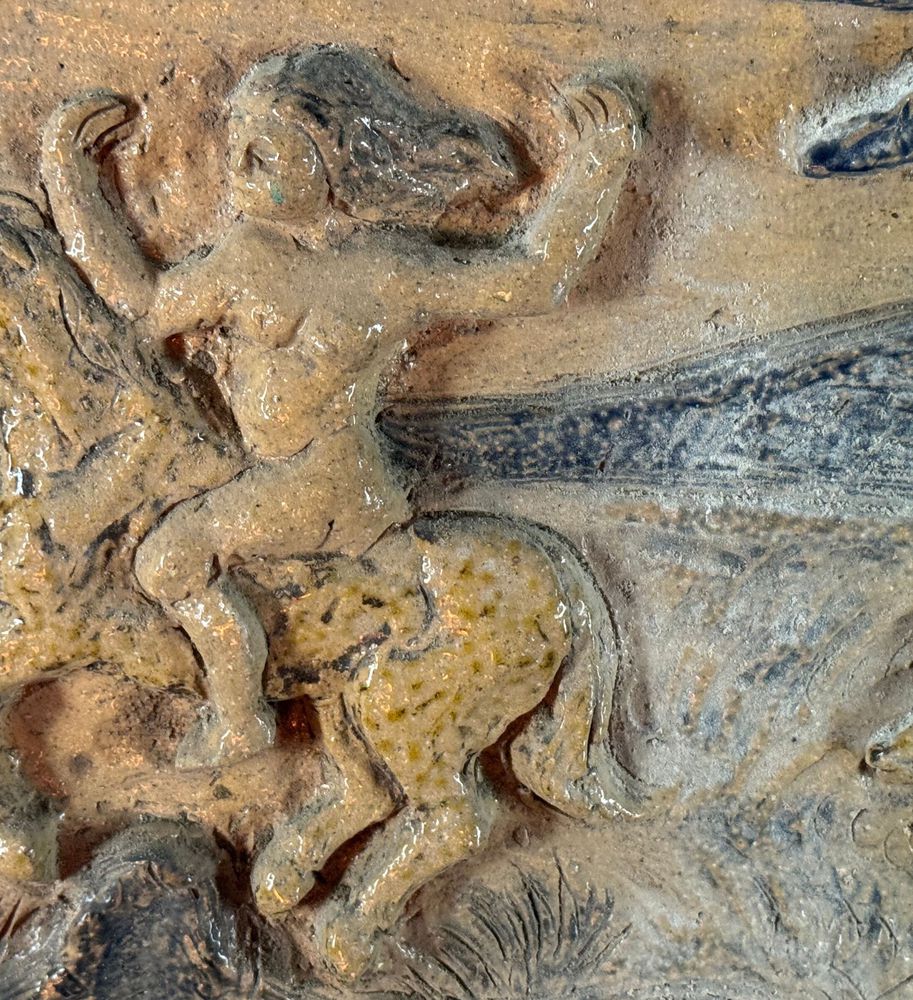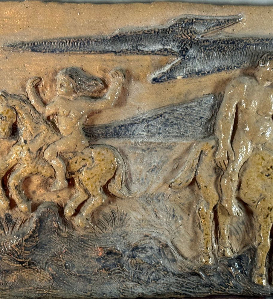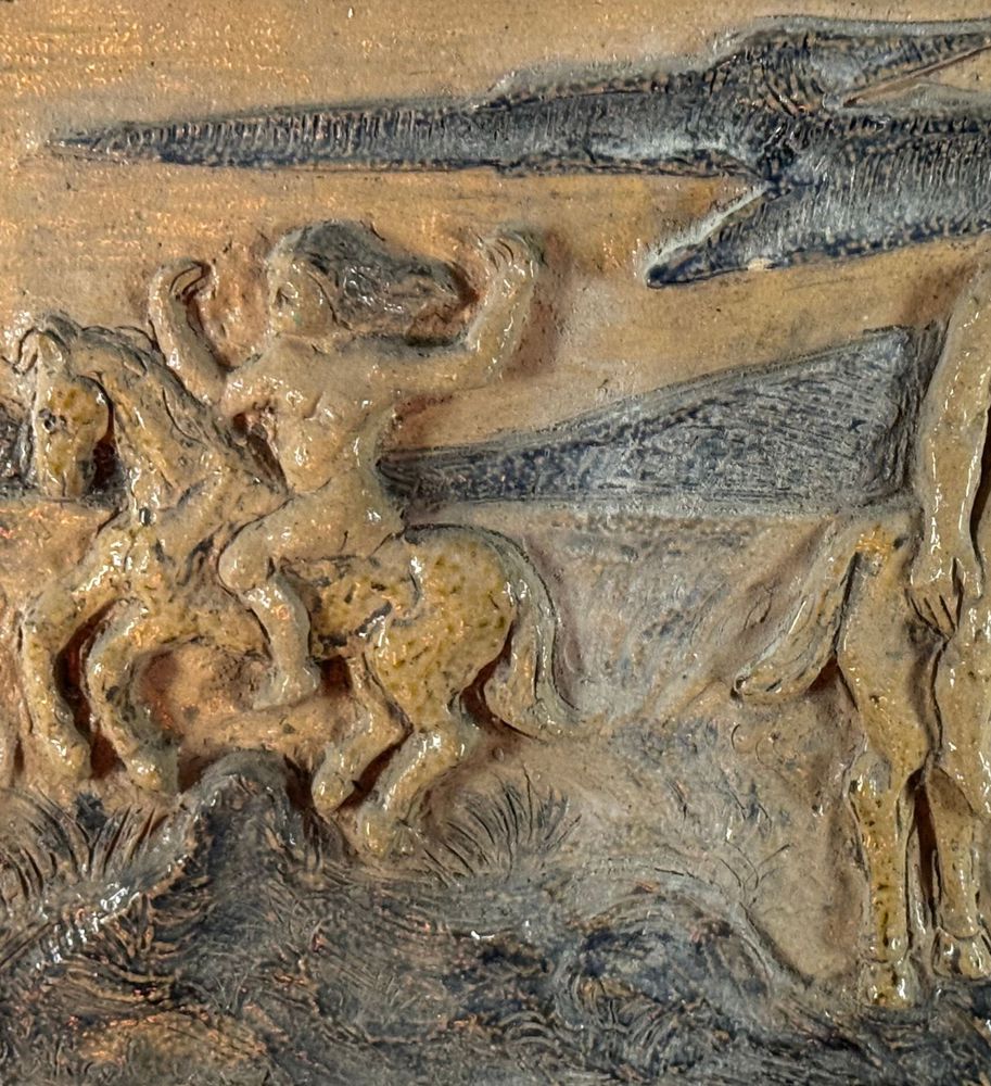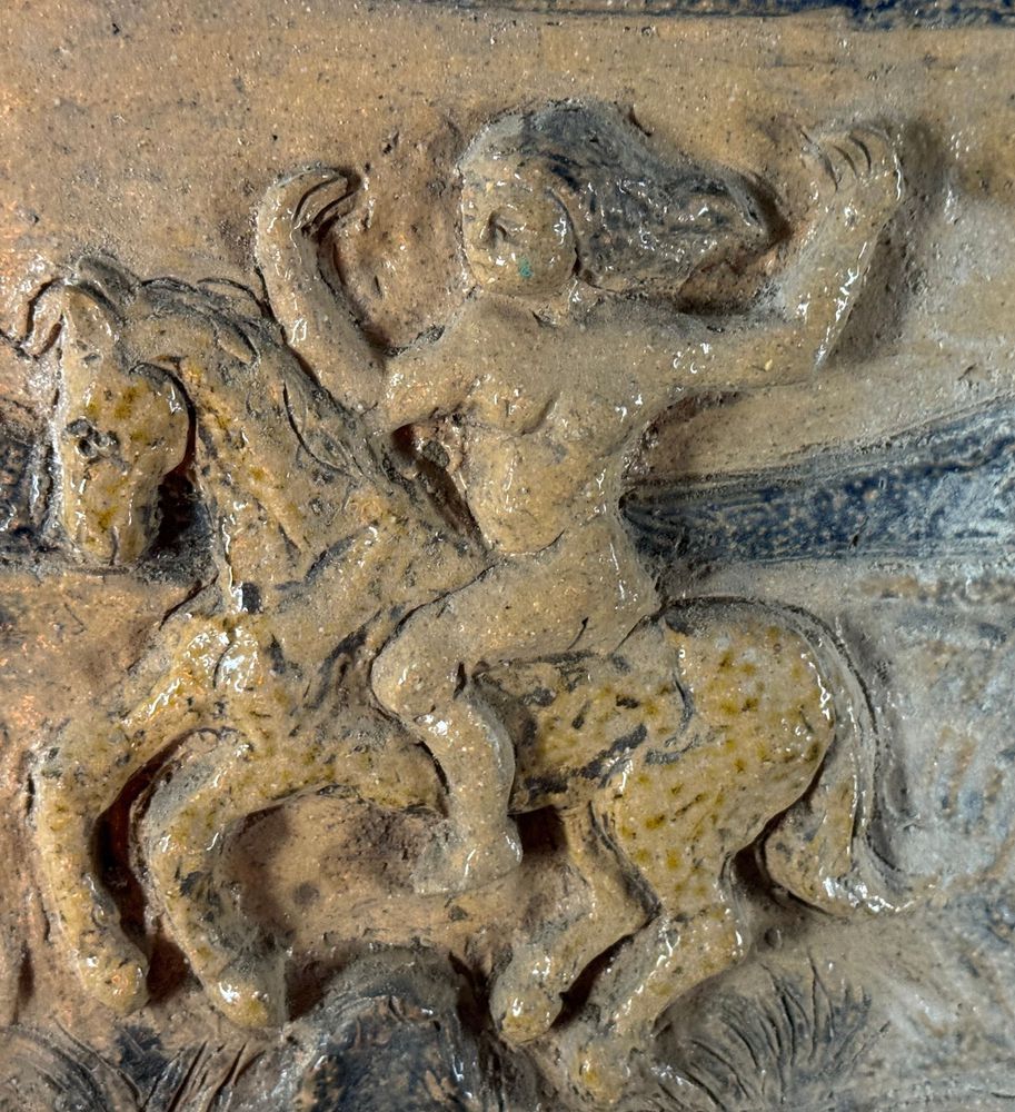 Placca in maiolica a basso rilievo, raffigurante Personaggi a cavallo....