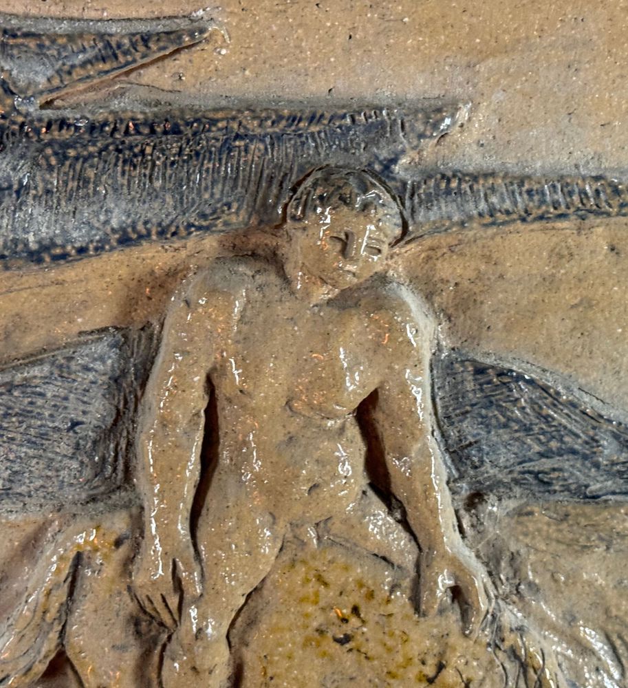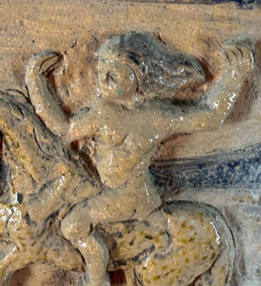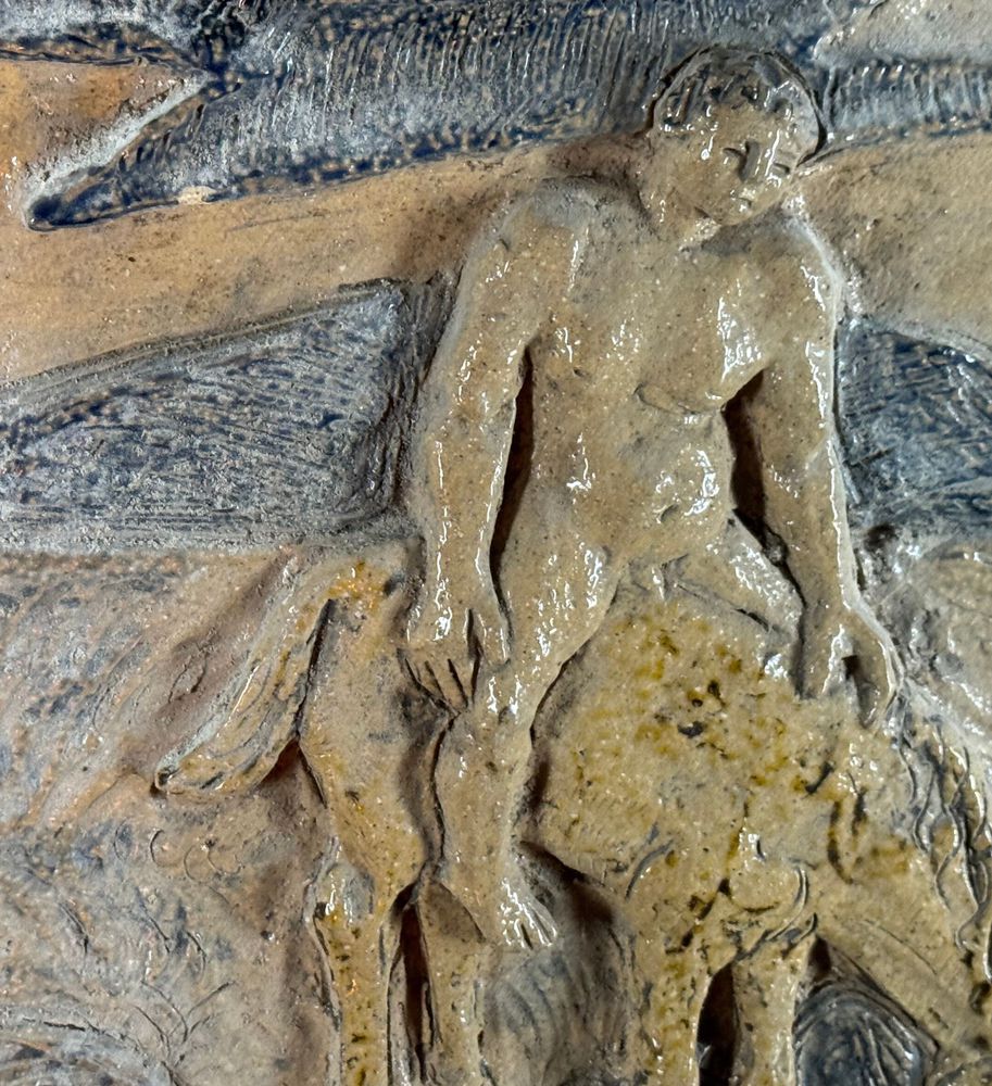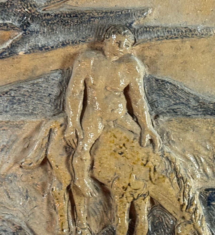 Placca in maiolica a basso rilievo, raffigurante Personaggi a cavallo....