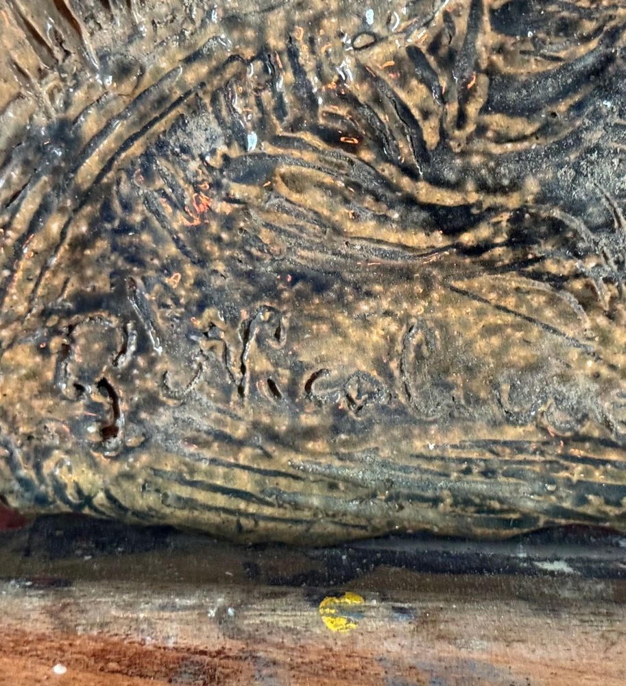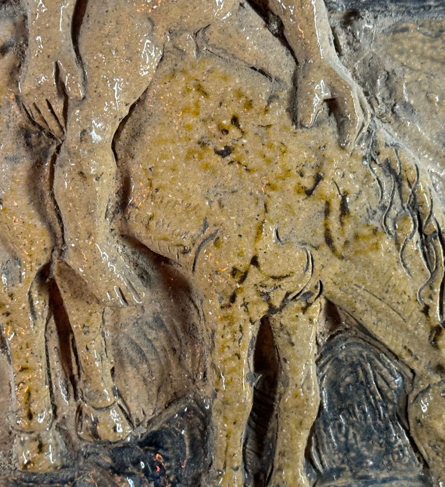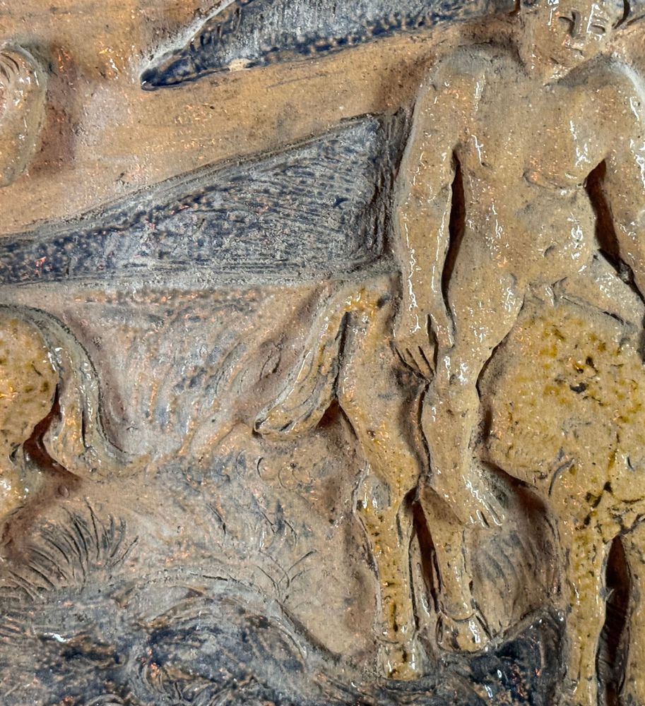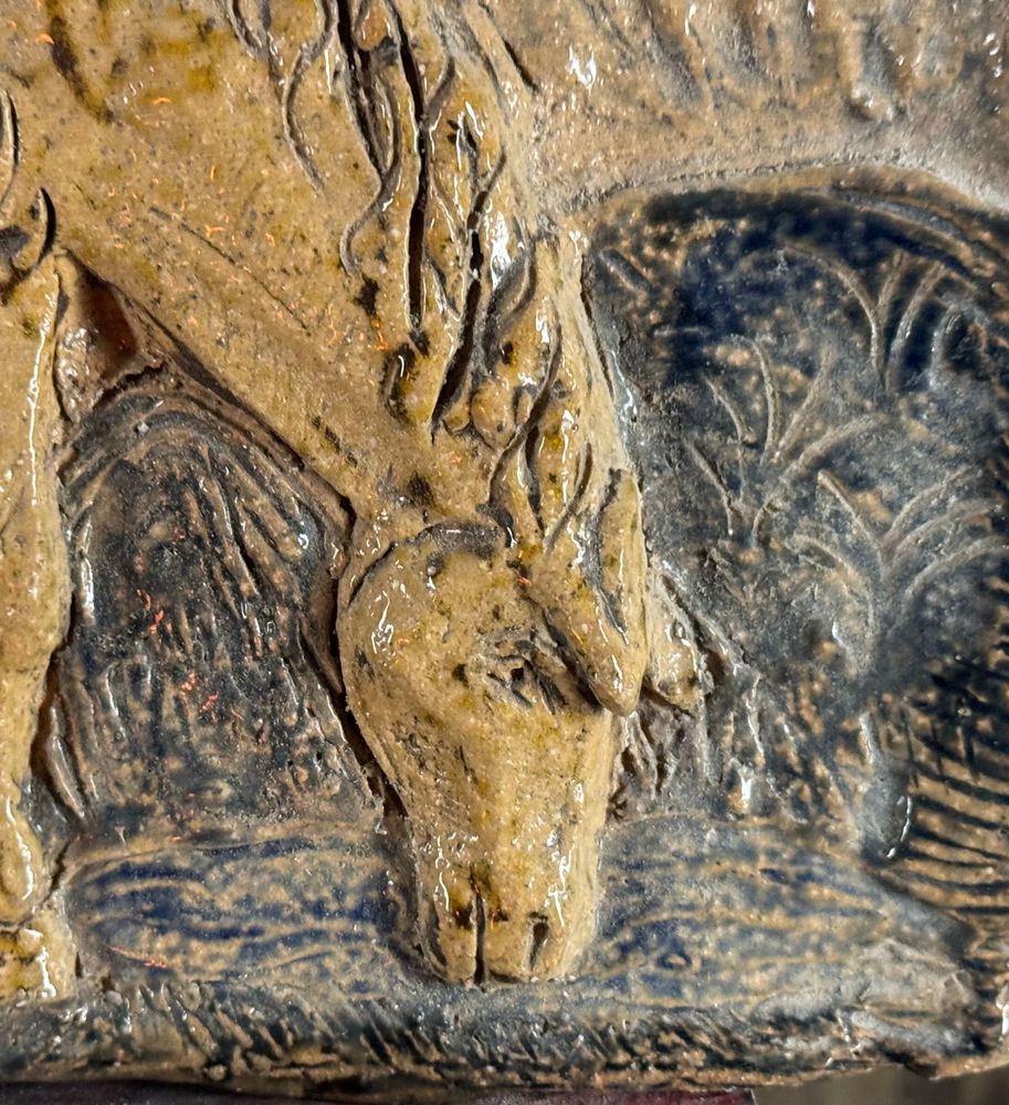 Placca in maiolica a basso rilievo, raffigurante Personaggi a cavallo. Dimensioni: 48x34 cm. In buone condizioni.
