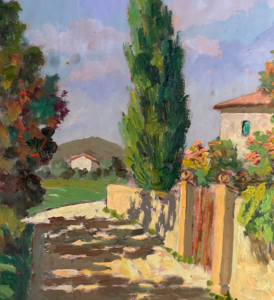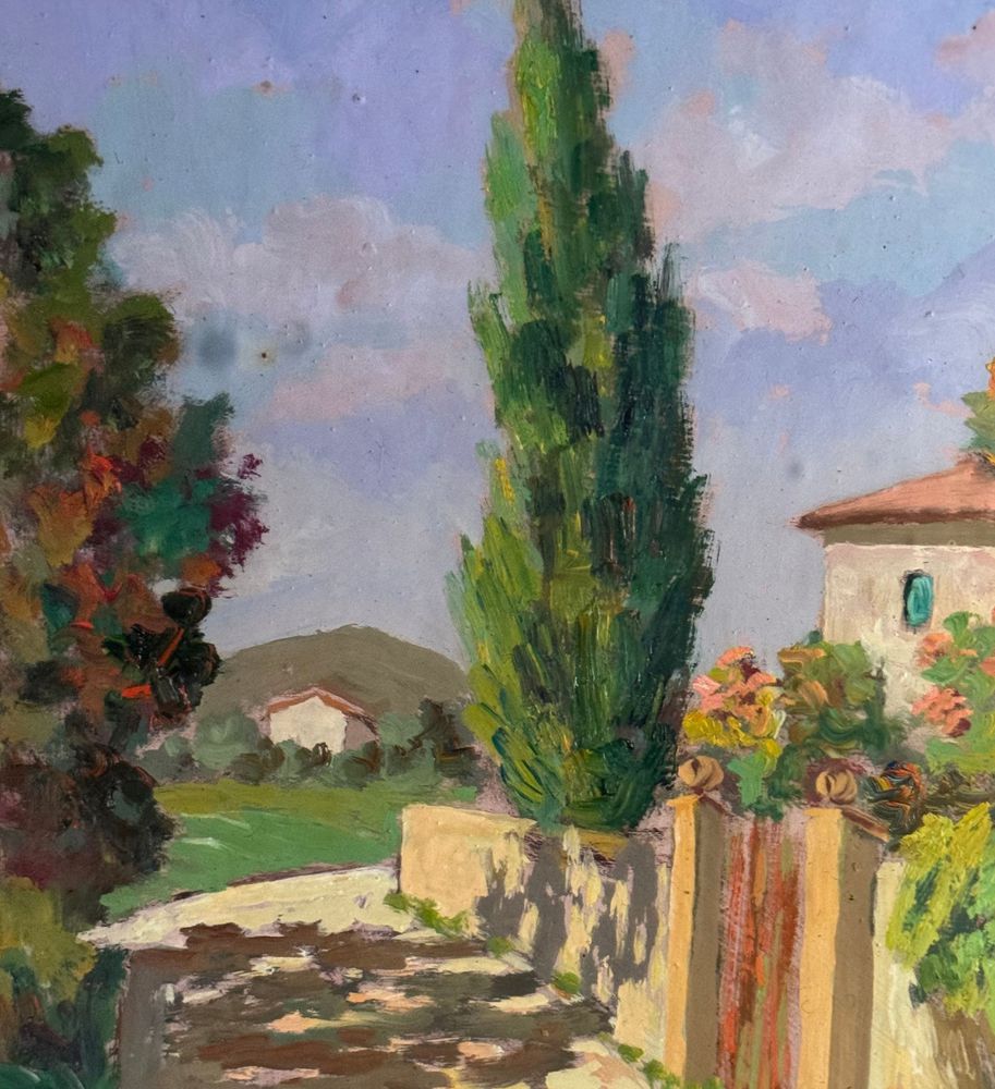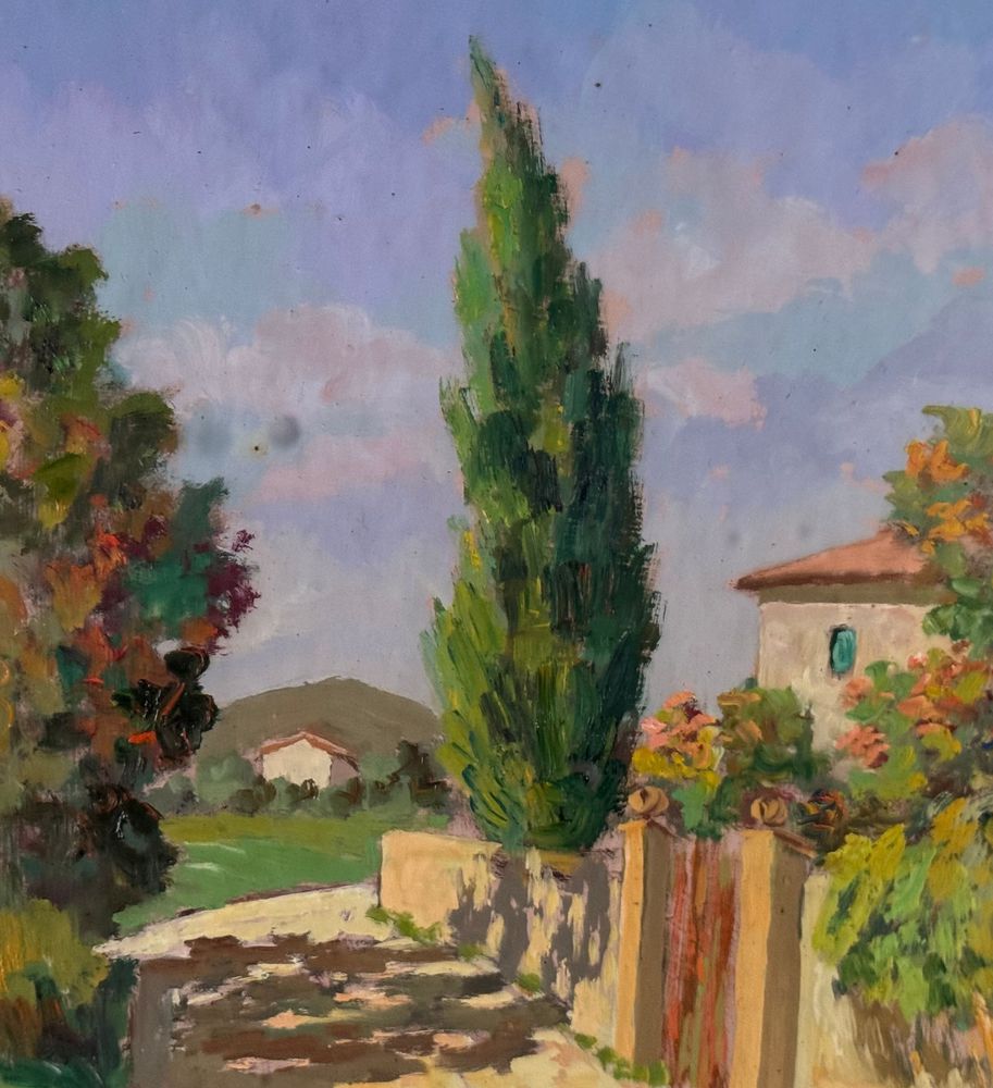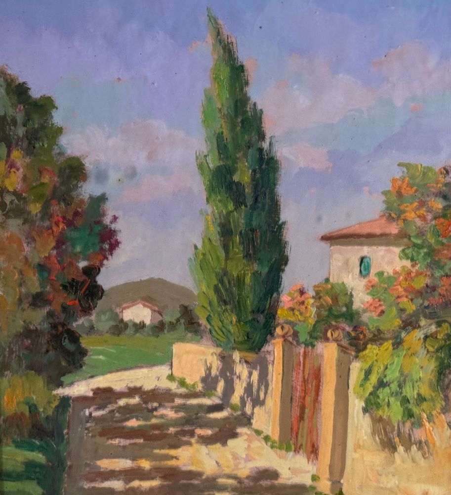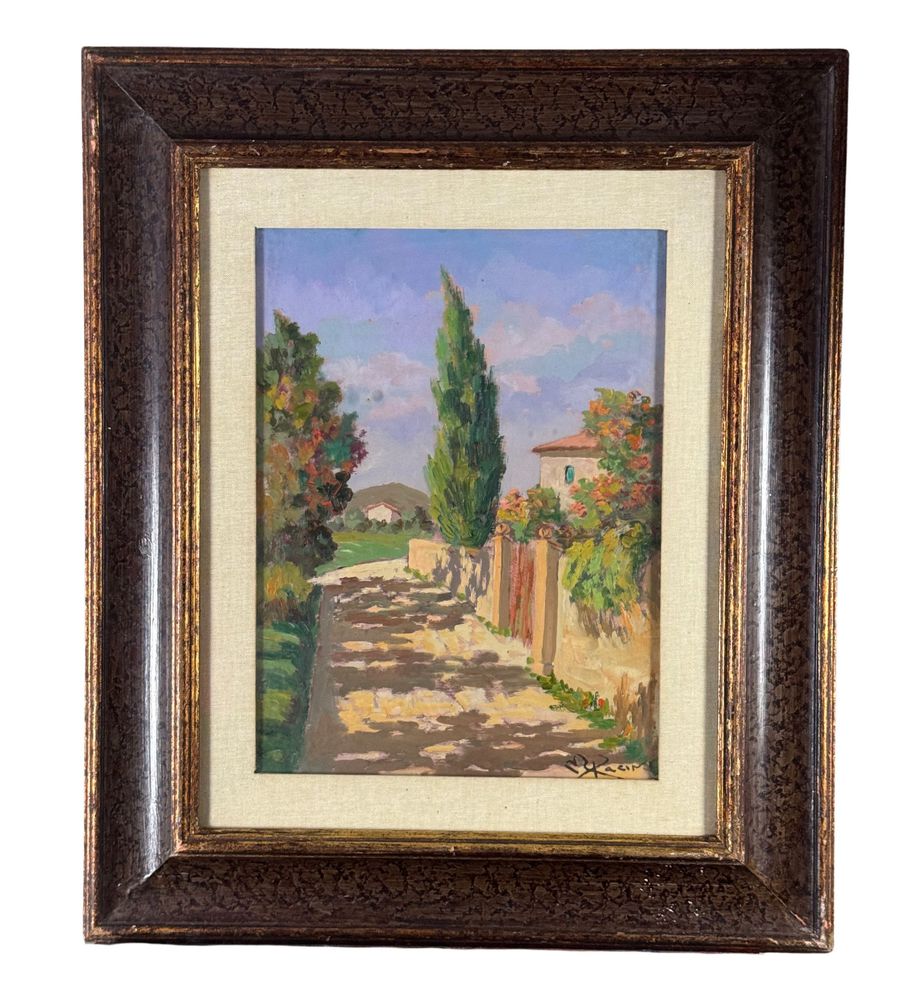 Pacini - Dipinto olio su pannello, periodo XX secolo, scuola Italiana raffigurante Stradina di campagna. Dimensioni compreso cornice: 54x63,5 cm. Dimensioni interno cornice: 30x40 cm. Firmato in basso a destra Pacini. Opera in buone condizioni.