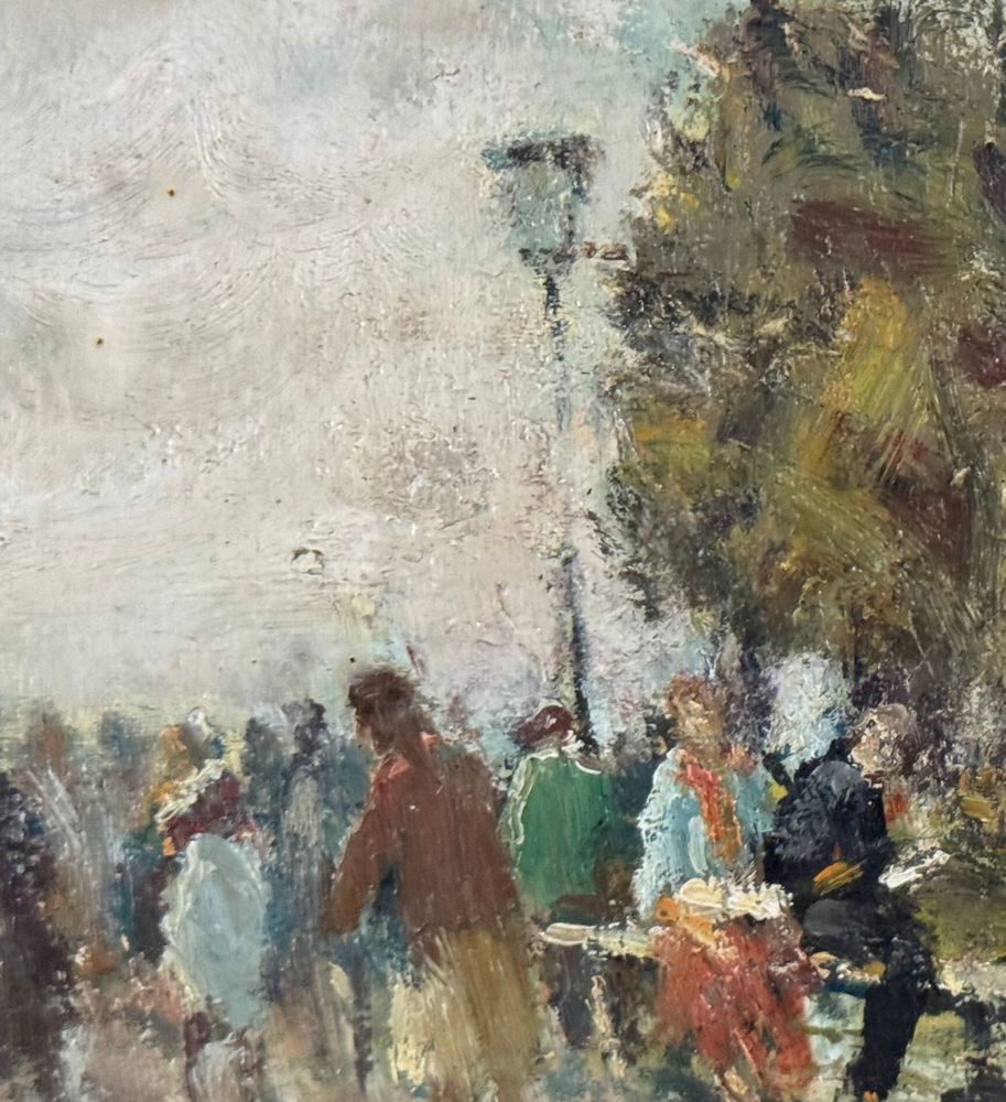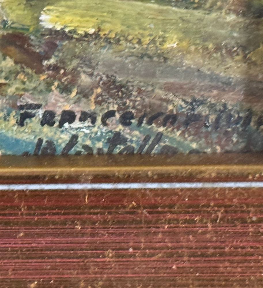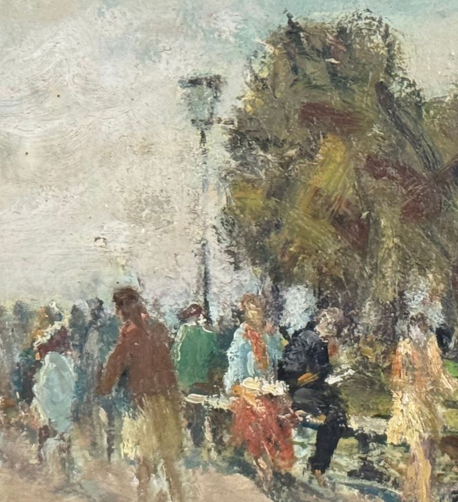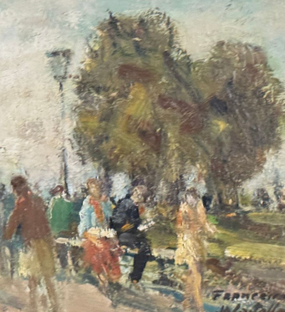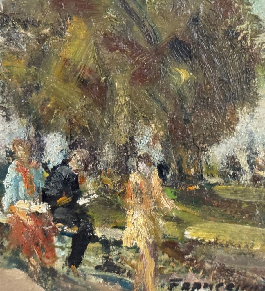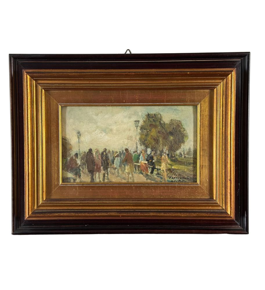 Francesco Filosa - Dipinto olio su tavola, periodo XX secolo, scuola Italiana raffigurante Personaggi al parco. Dimensioni compreso cornice: 43x33 cm. Dimensioni interno cornice: 26x15,5 cm. Firmato in basso a destra Francesco Filosa. Opera in buone condizioni.
