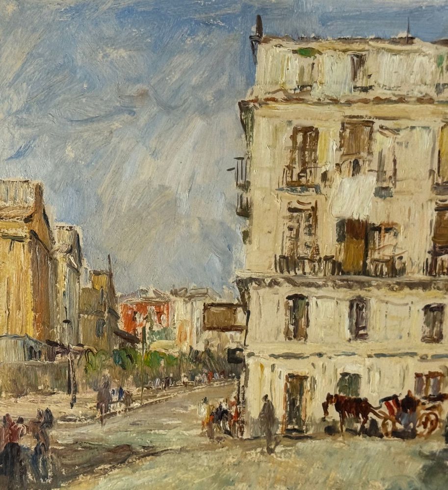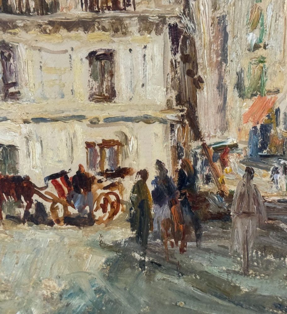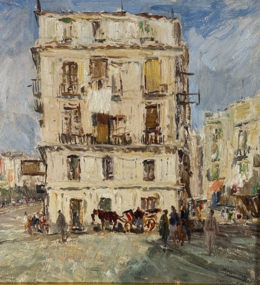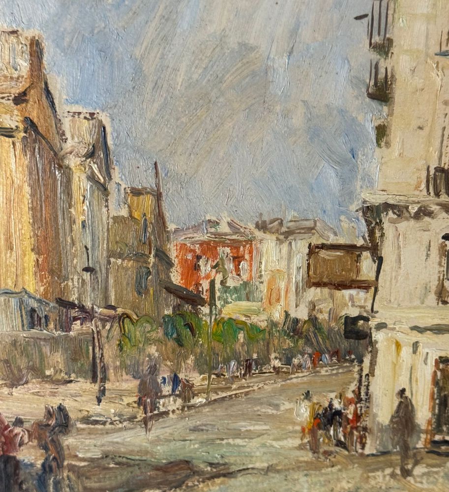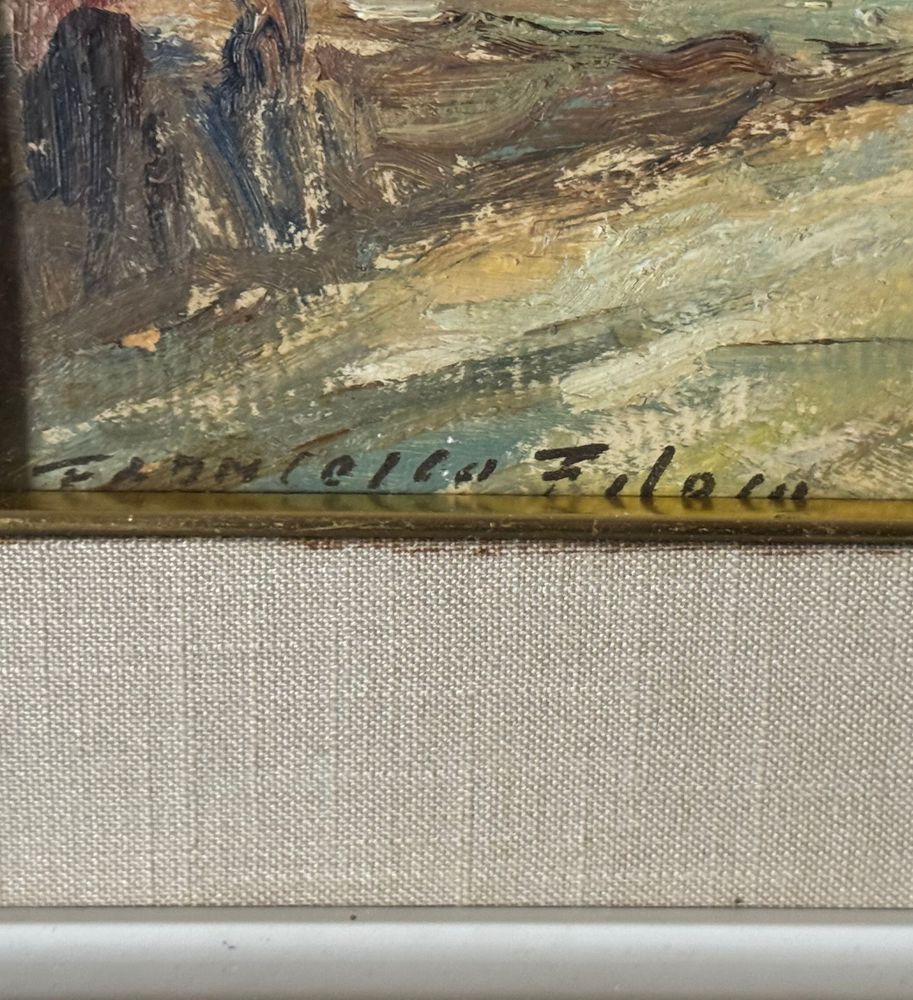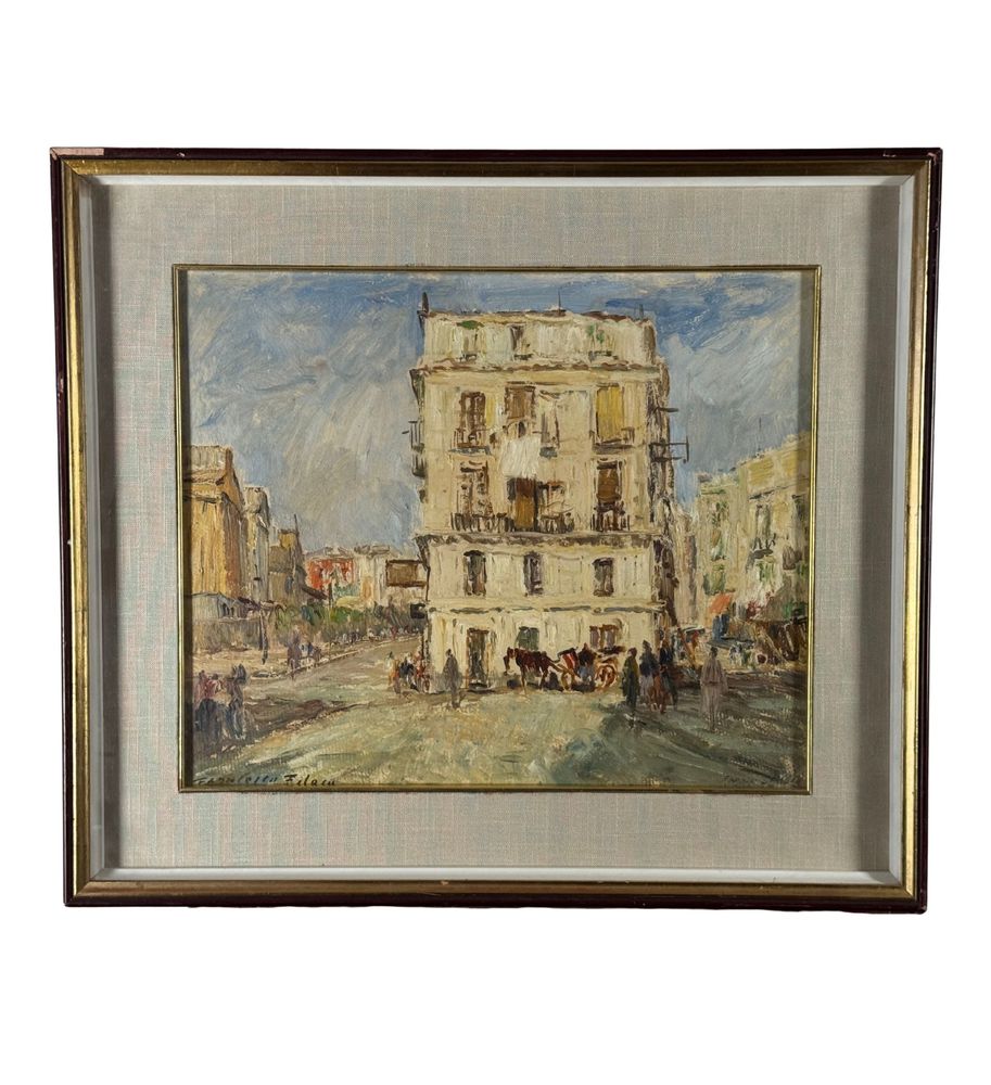 Francesco Filosa - Dipinto olio su pannello, periodo XX secolo, scuola Italiana, raffigurante Strada con personaggi. Dimensioni compreso cornice: 56x49 cm. Dimensioni interno cornice: 43x35 cm. Firmato in basso a sinistra Francesco Filosa. Opera in buone condizioni.