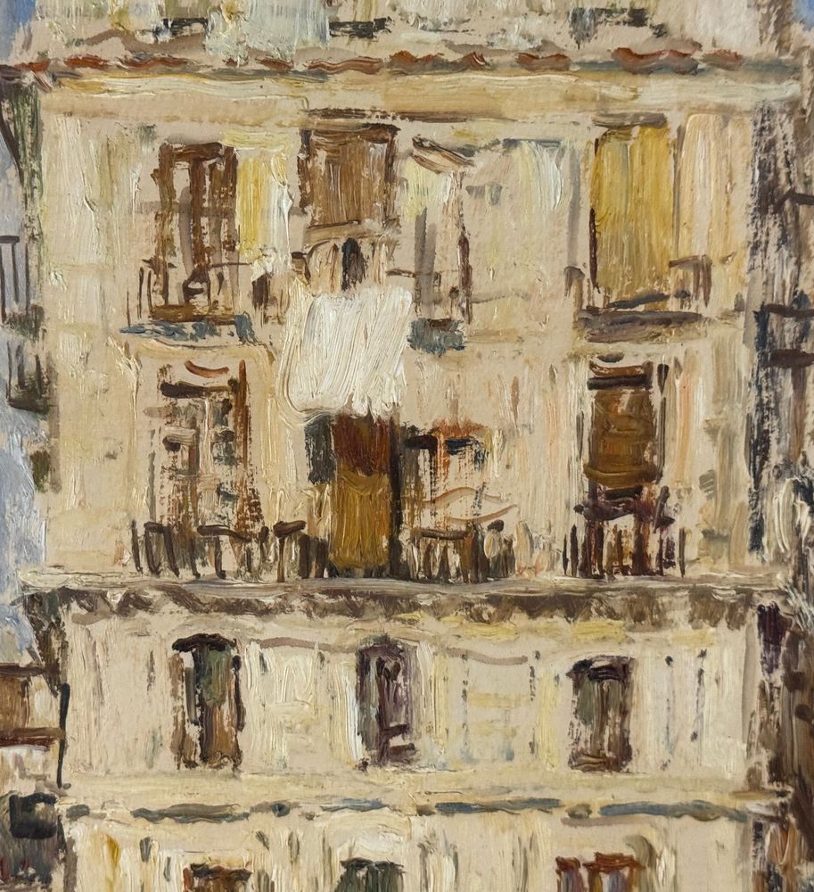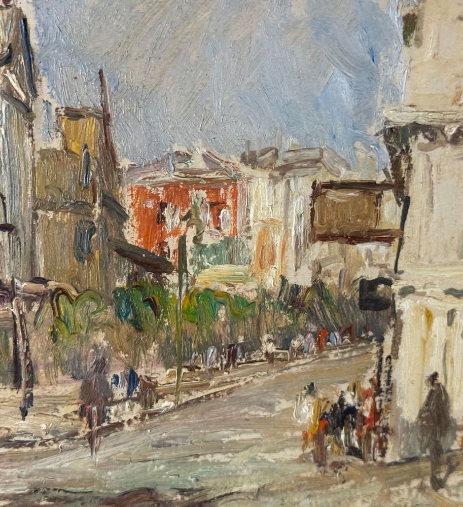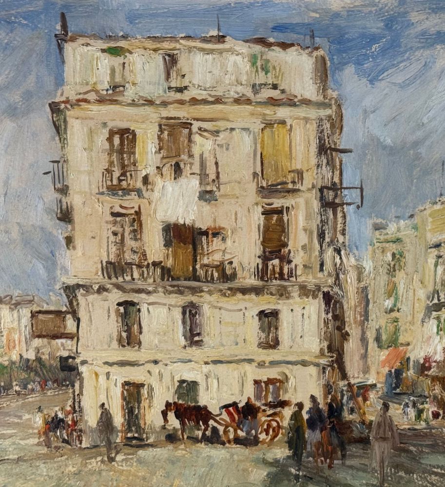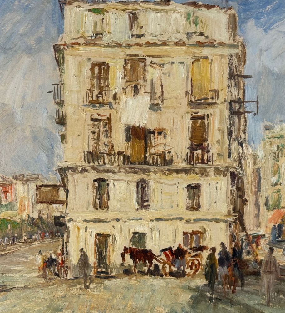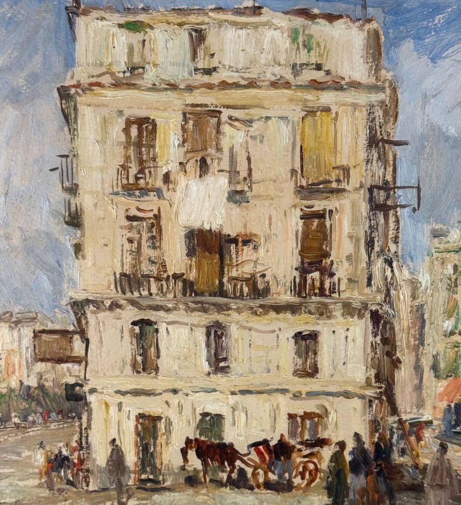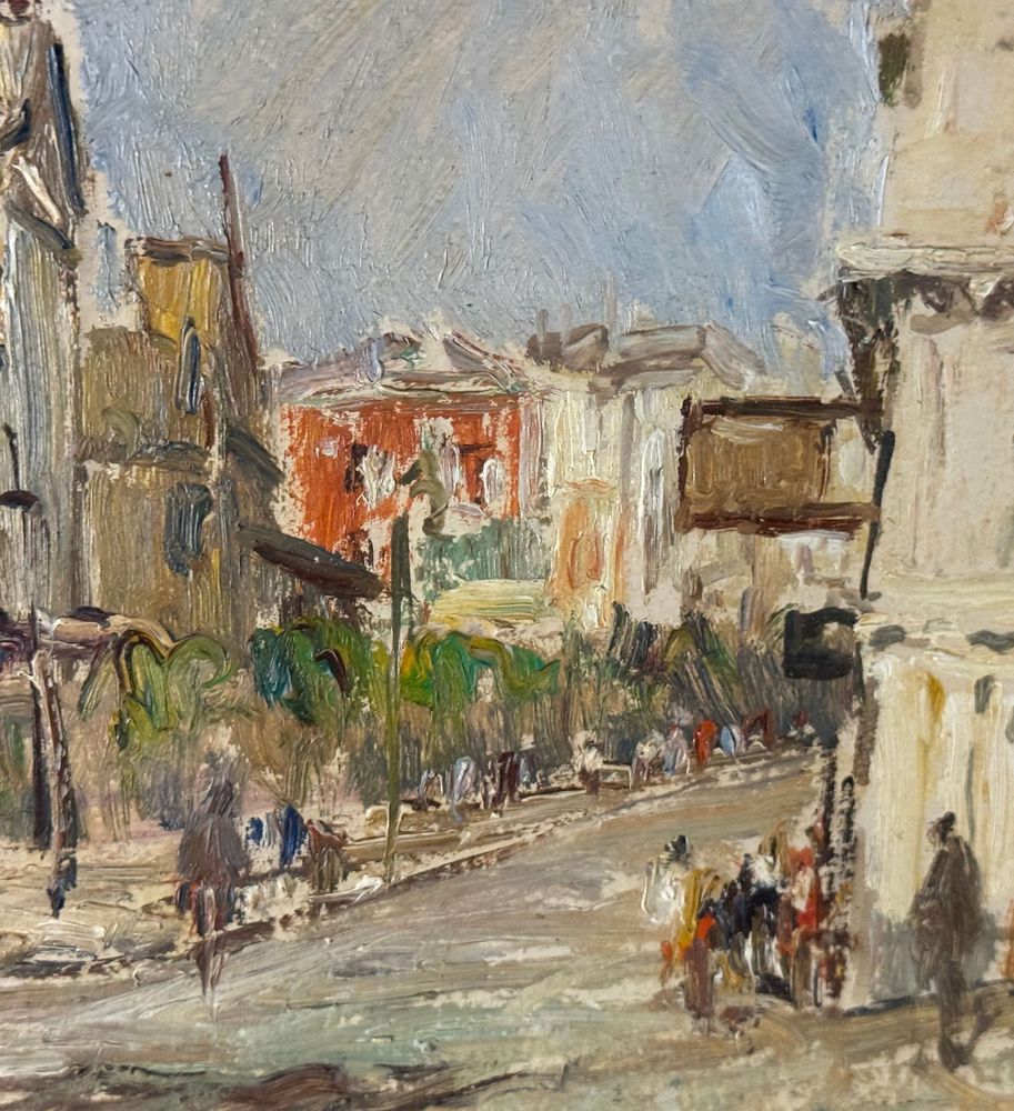 Francesco Filosa - Dipinto olio su pannello, periodo XX secolo, scuola Italiana, raffigurante Strada con personaggi. Dimensioni compreso cornice: 56x49 cm. Dimensioni interno cornice: 43x35 cm. Firmato in basso a sinistra Francesco Filosa. Opera in buone condizioni.