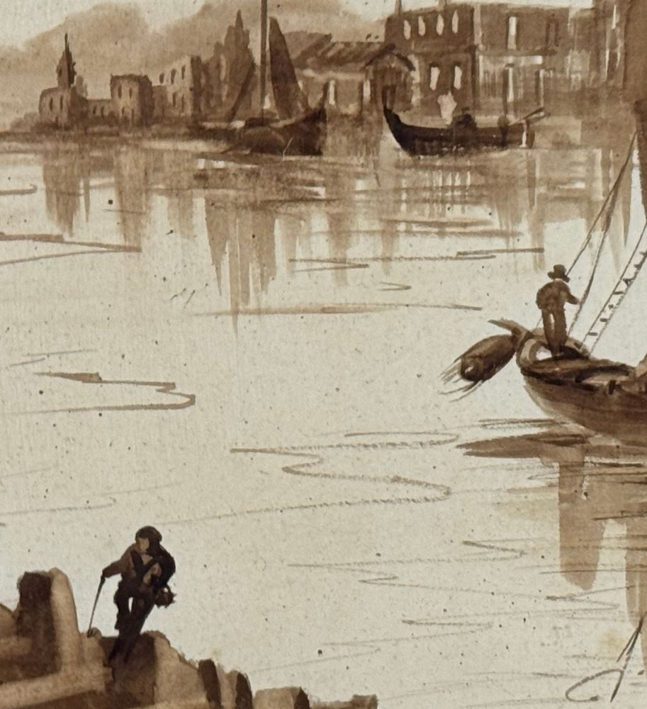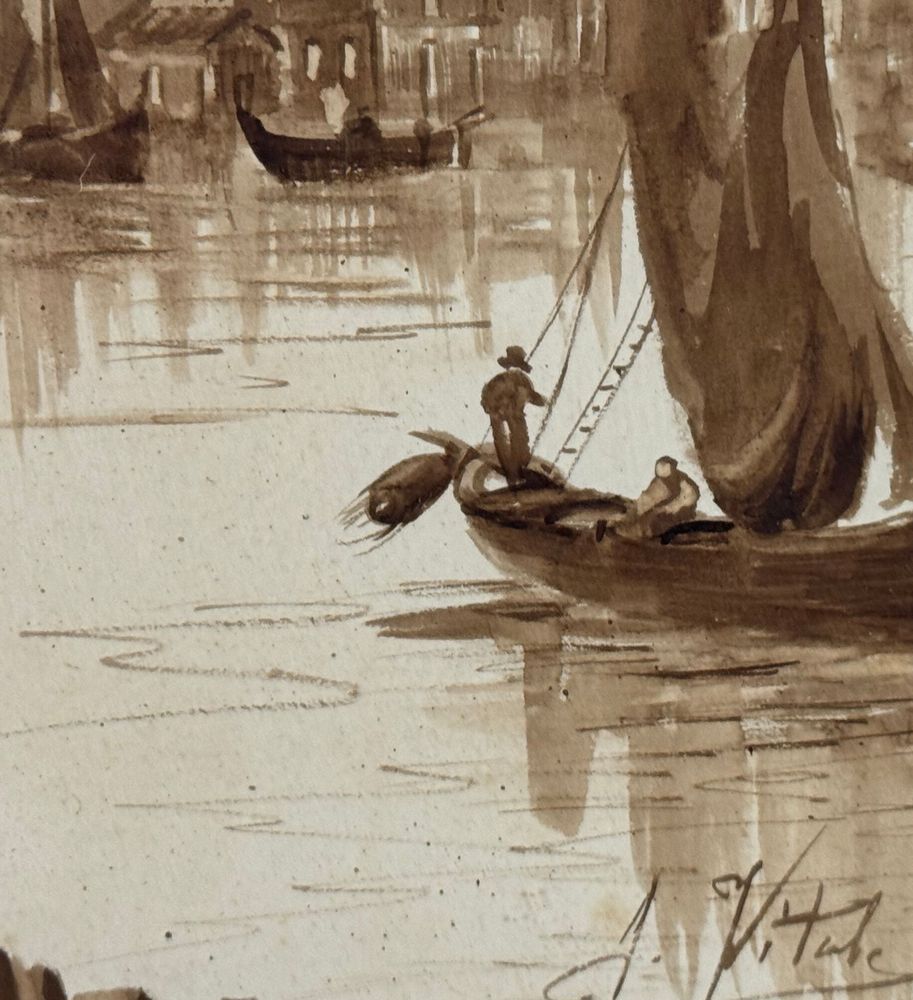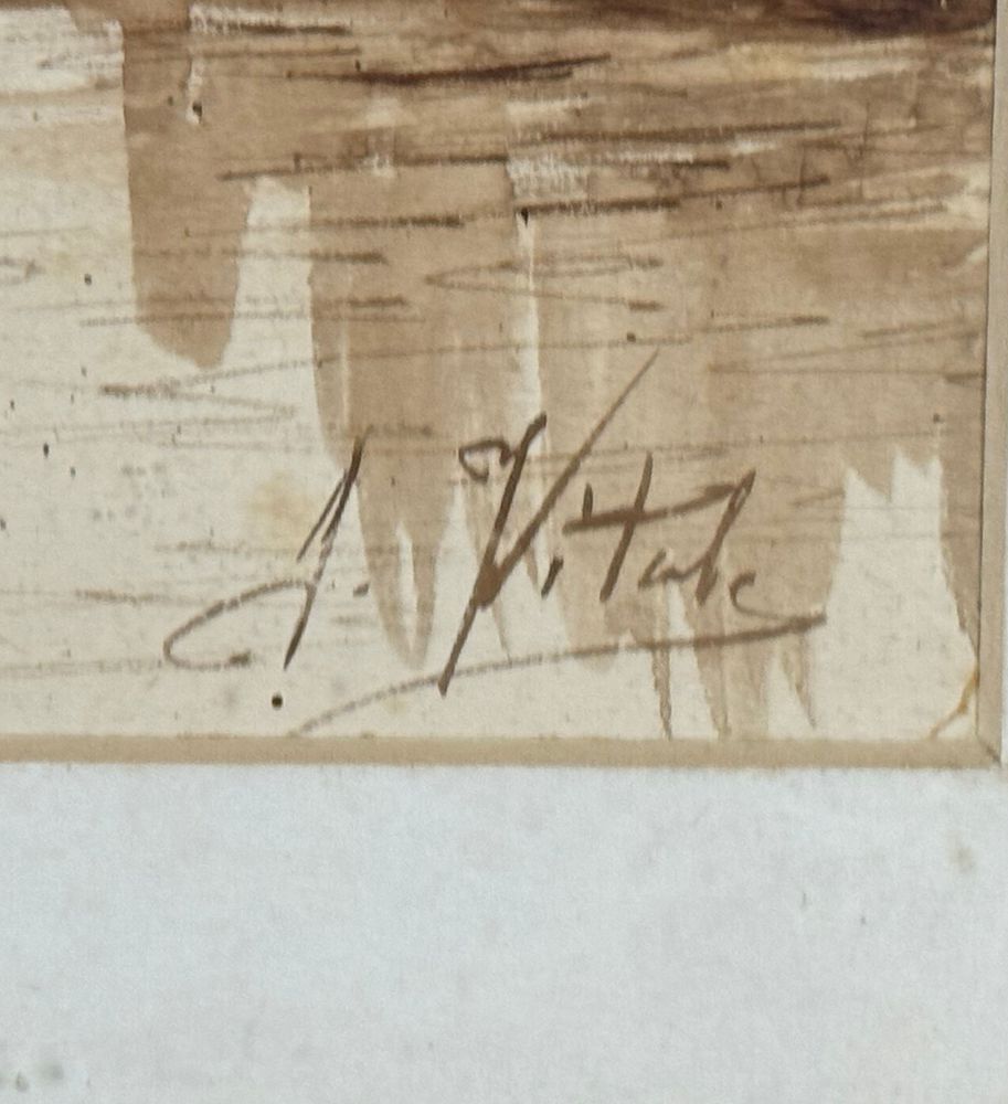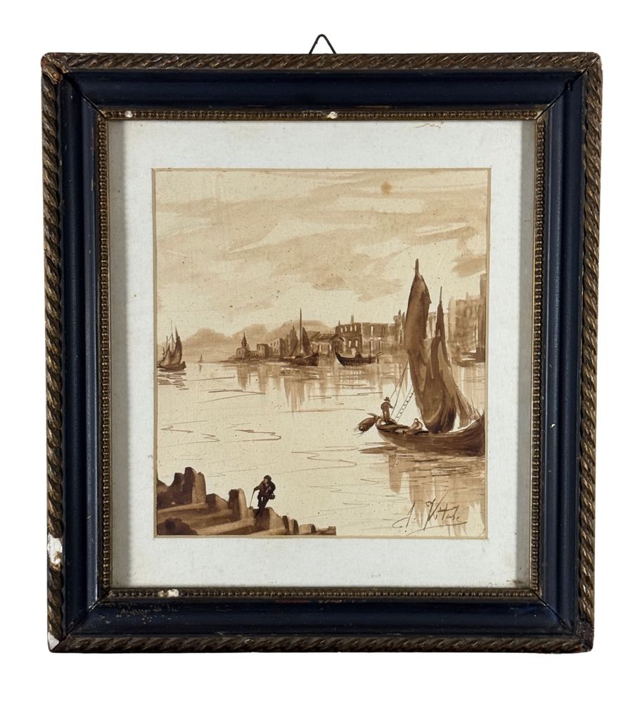 Vitale - Dipinto seppia su carta, periodo XX secolo, scuola Italiana, raffigurante Scorcio di marina con battelli. Dimensioni compreso cornice: 32x34 cm. Dimensioni interno cornice: 20x22 cm. Firmato in basso a destra Vitale. Opera in buone condizioni.
