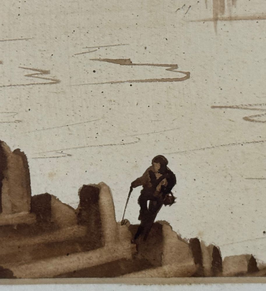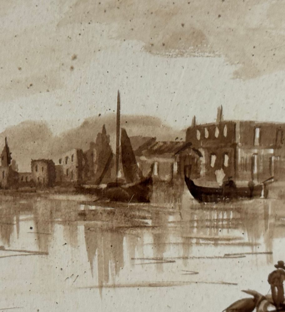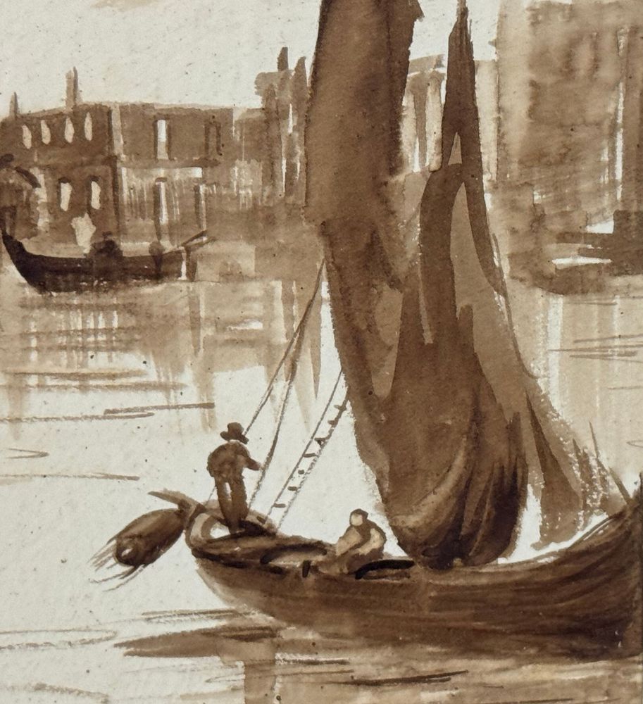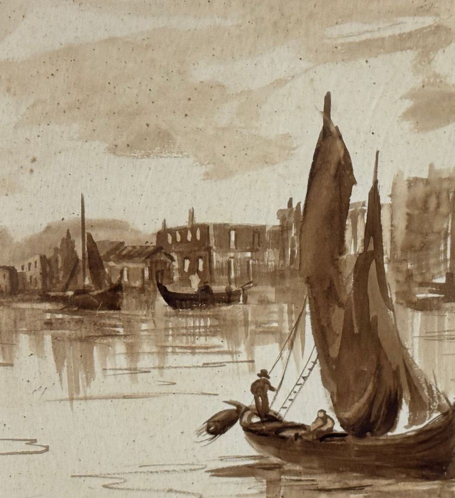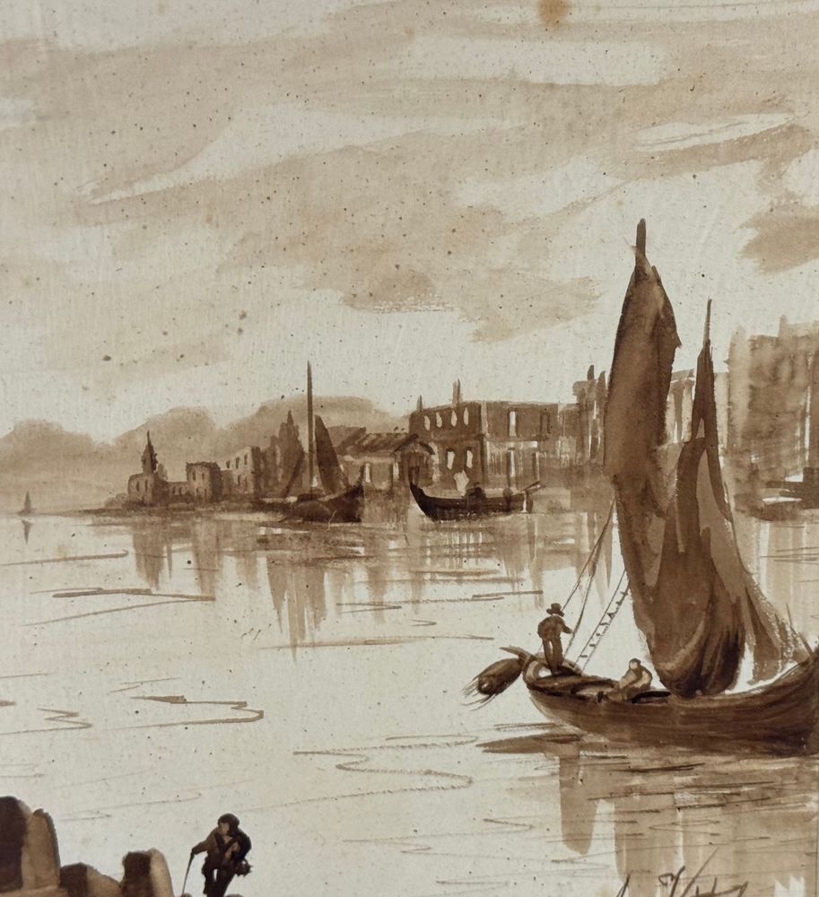 Vitale - Dipinto seppia su carta, periodo XX secolo, scuola Italiana, raffigurante Scorcio di marina con battelli. Dimensioni compreso cornice: 32x34 cm. Dimensioni interno cornice: 20x22 cm. Firmato in basso a destra Vitale. Opera in buone condizioni.