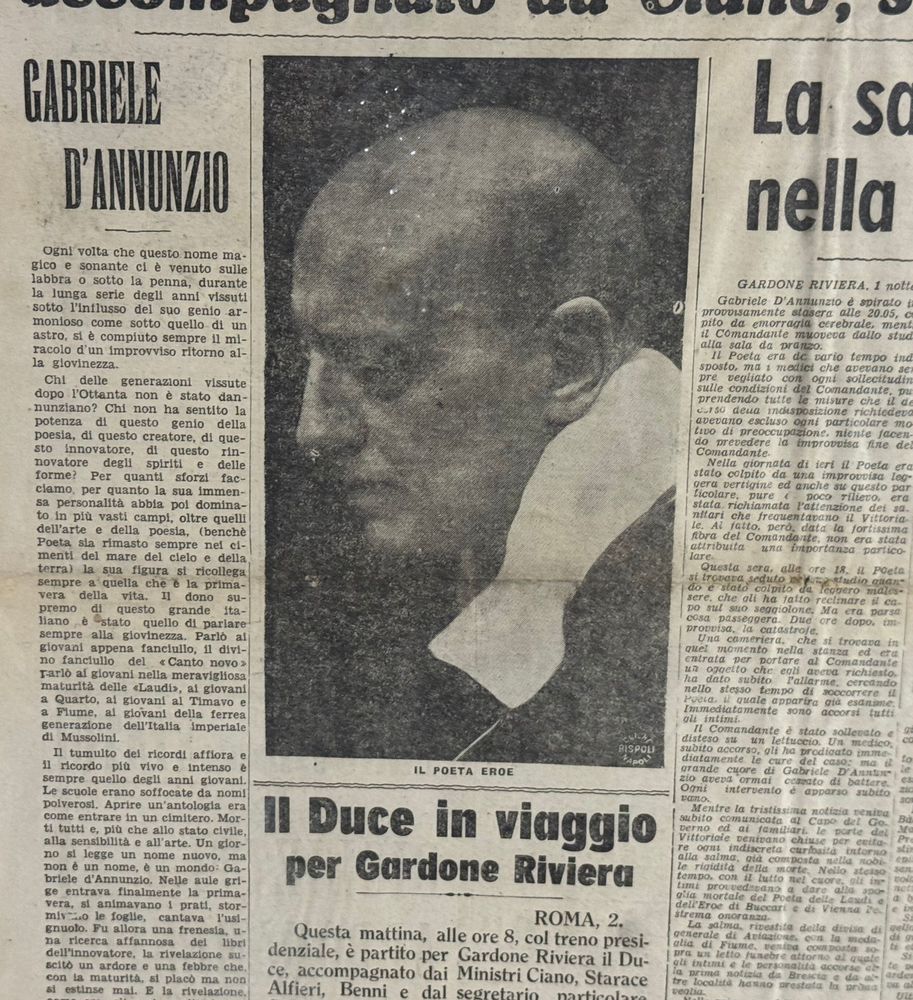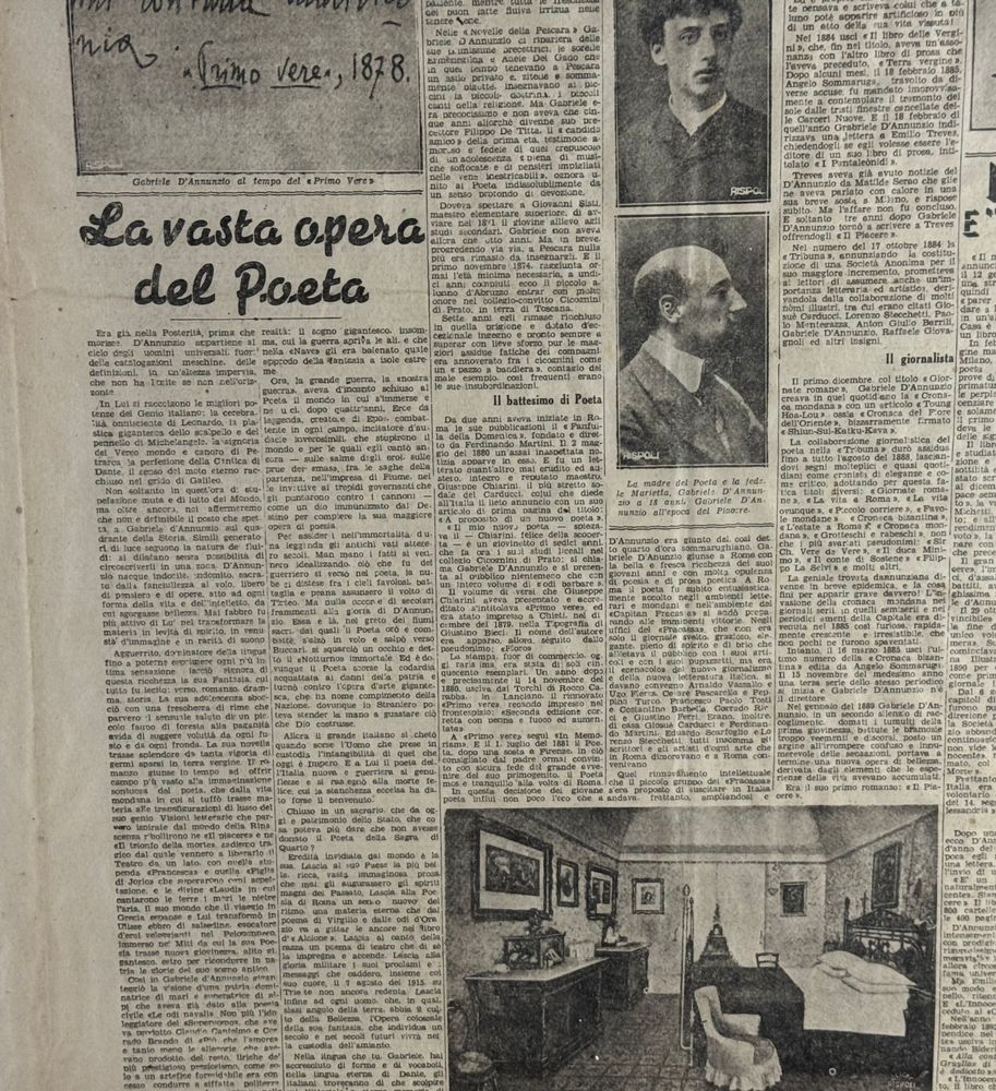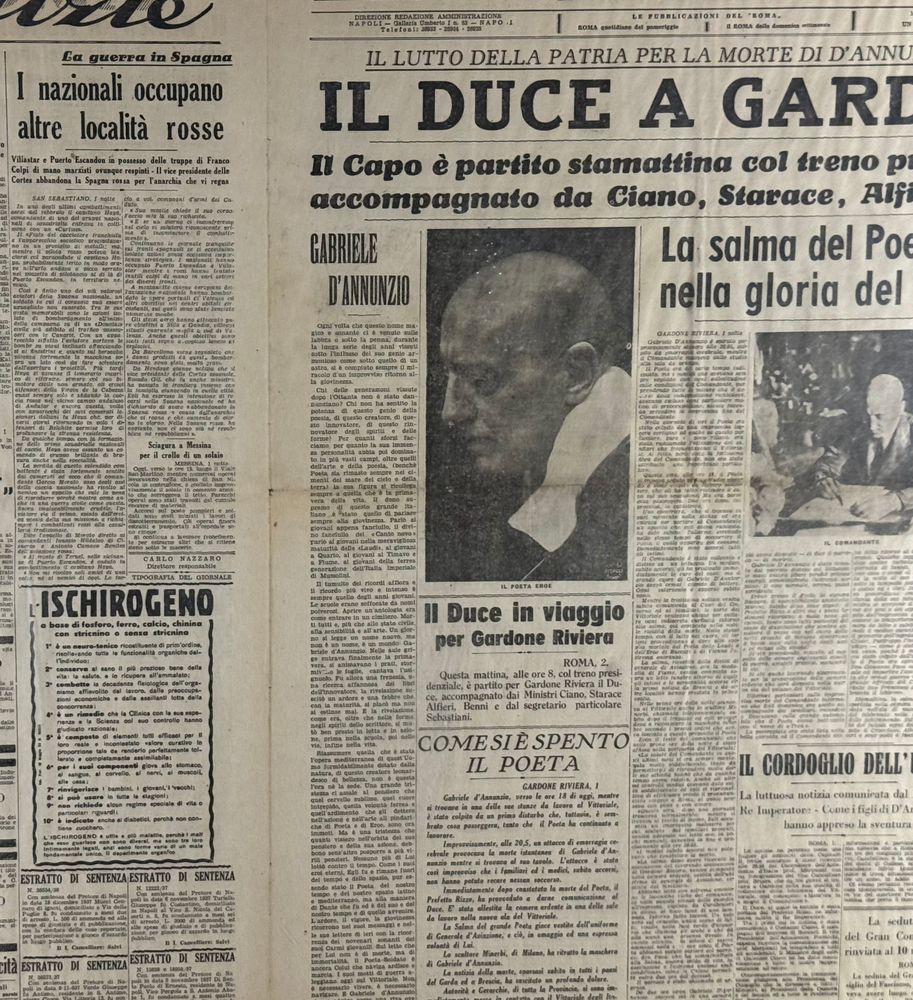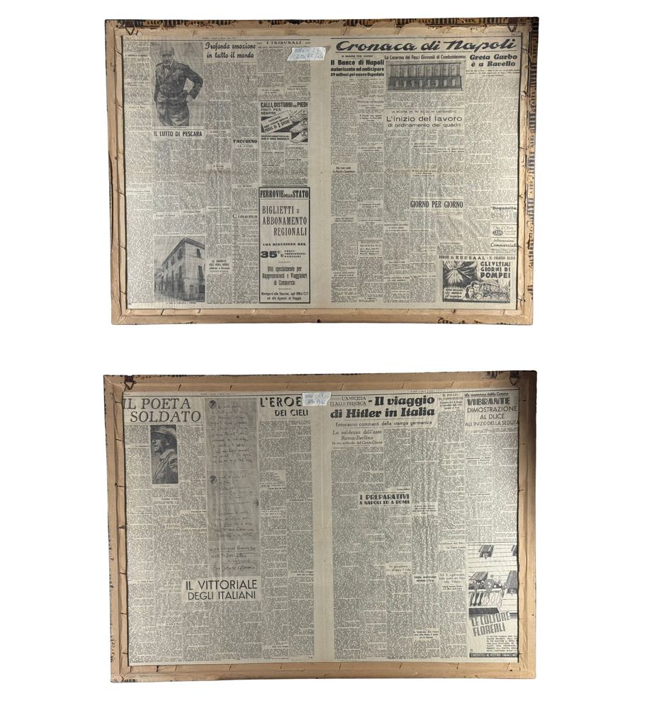 Coppia di pagine di Giornale "Roma", periodo 1938, in riferimento a Gabriele D'Annunzio. Ciascuna misura compreso cornice: 85x61 cm. Si presentano in buone condizioni con lievi segni di vissuto come da foto allegate.