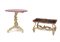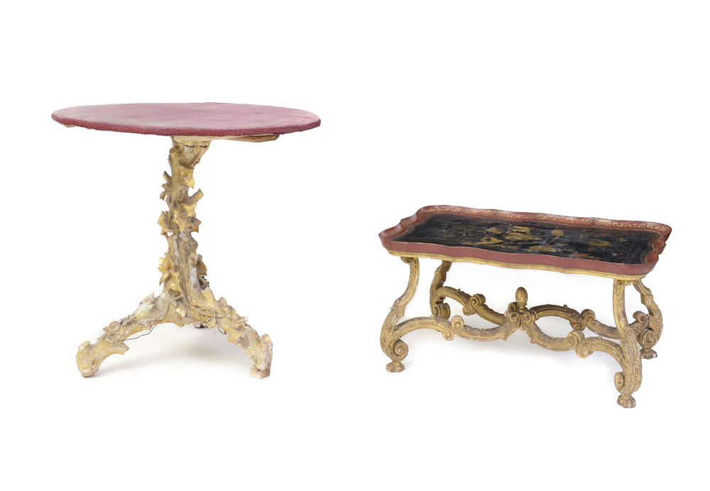 DUE TAVOLINI IN LEGNO SCOLPITO E DORATO, XIX SECOLO, in stile settecentesco uno con piano laccato a paesaggio con volatili e uno con piano moderno e sostegno fitomorfo; danni e mancanze.
