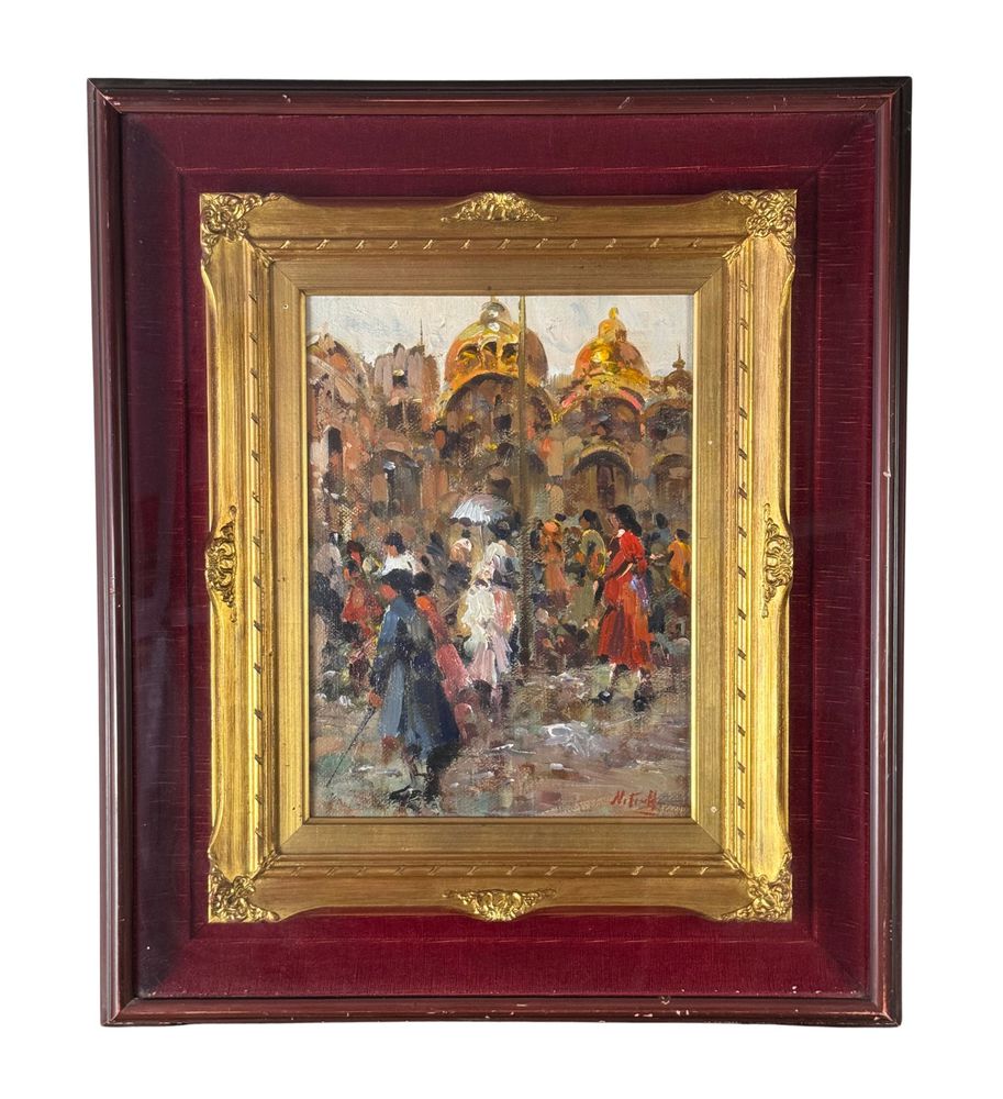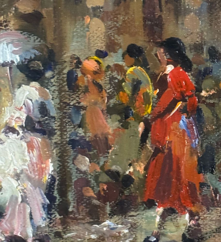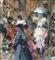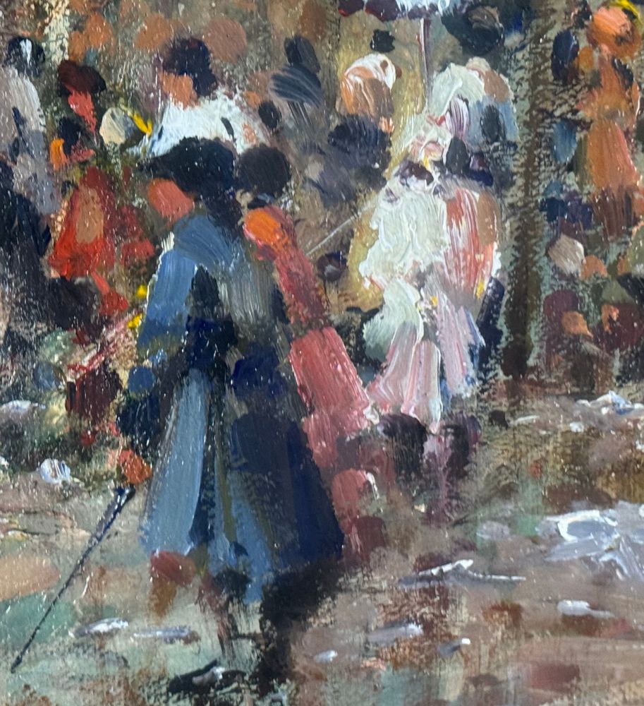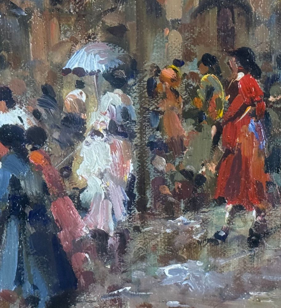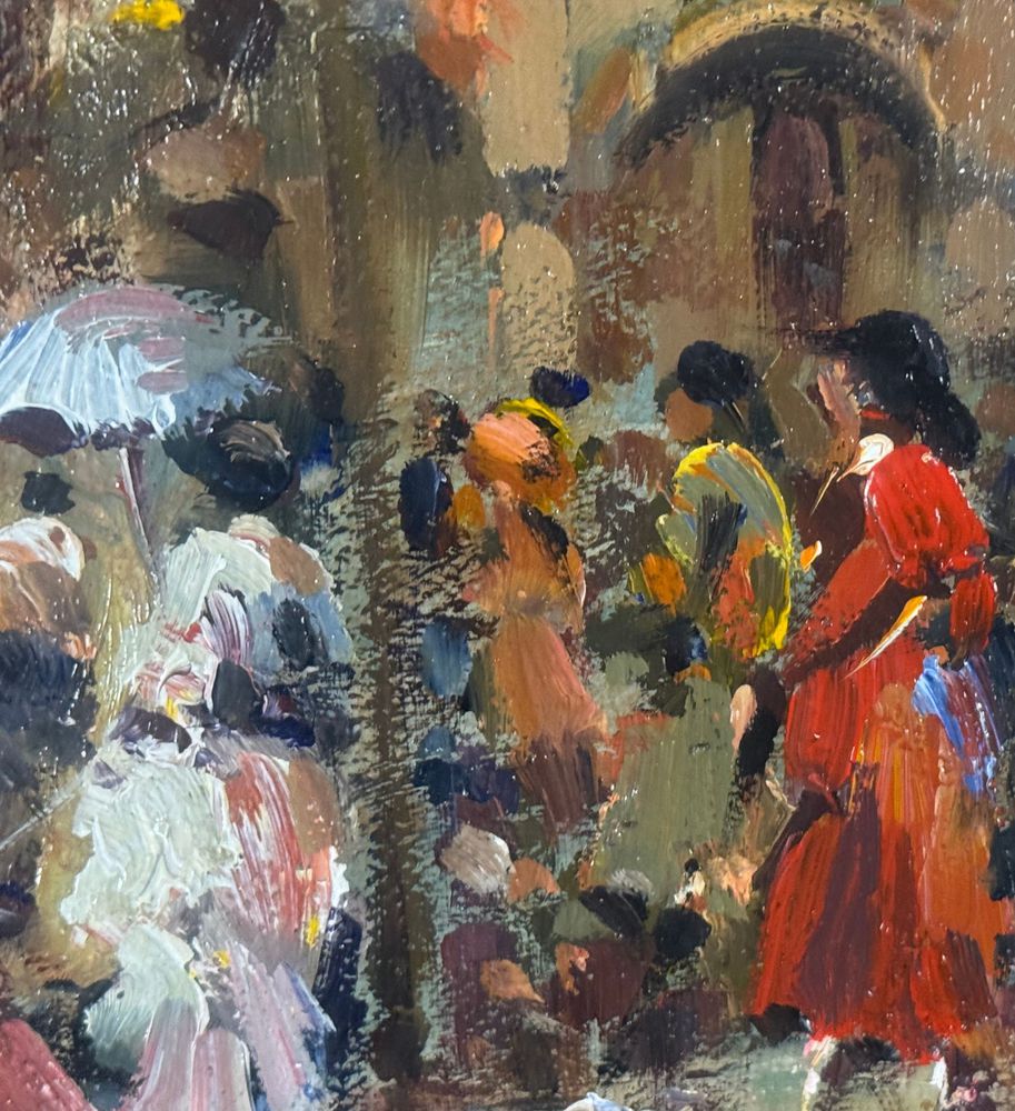 SCUOLA EUROPEA - Dipinto olio su tela, periodo XX secolo, scuola Europea raffigurante Strada con personaggi. Dimensioni compreso cornice: 59x69 cm. Dimensioni interno cornice: 30x40 cm. Firmato in basso a destra artista non identificato. Opera in buone condizioni.