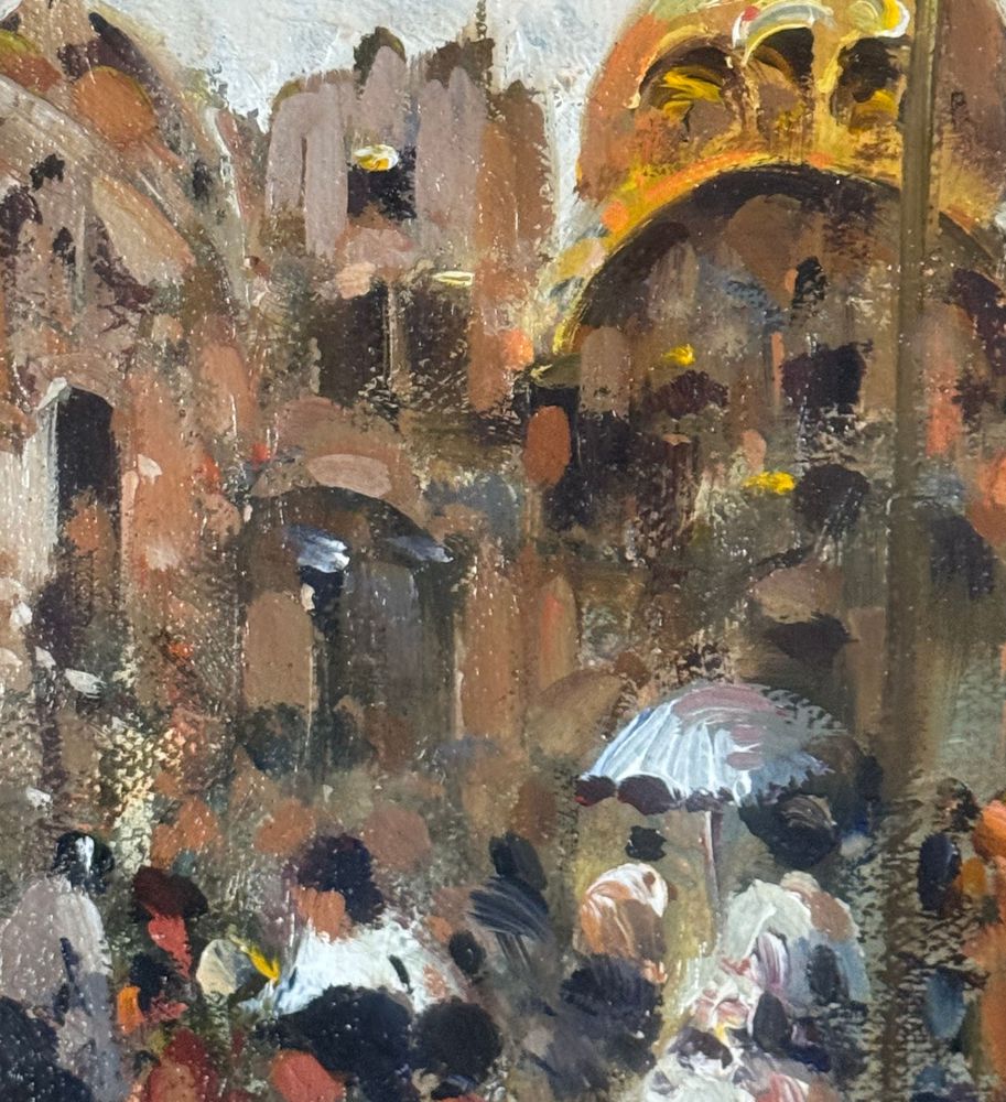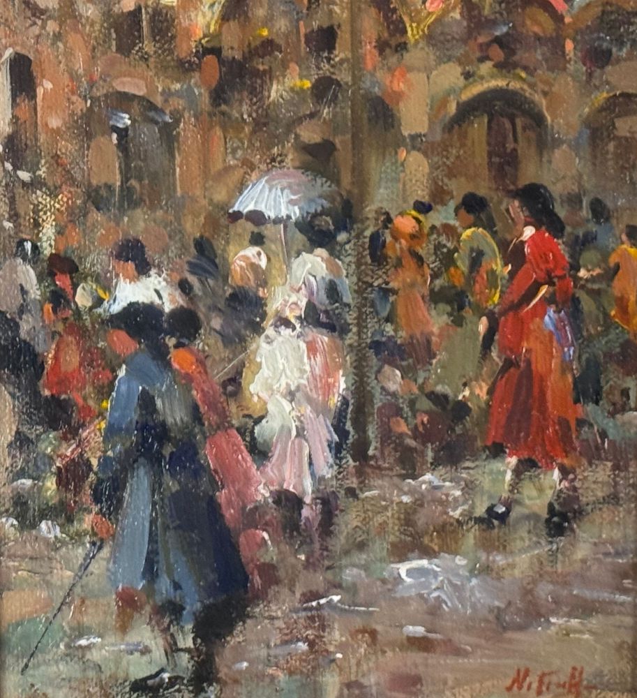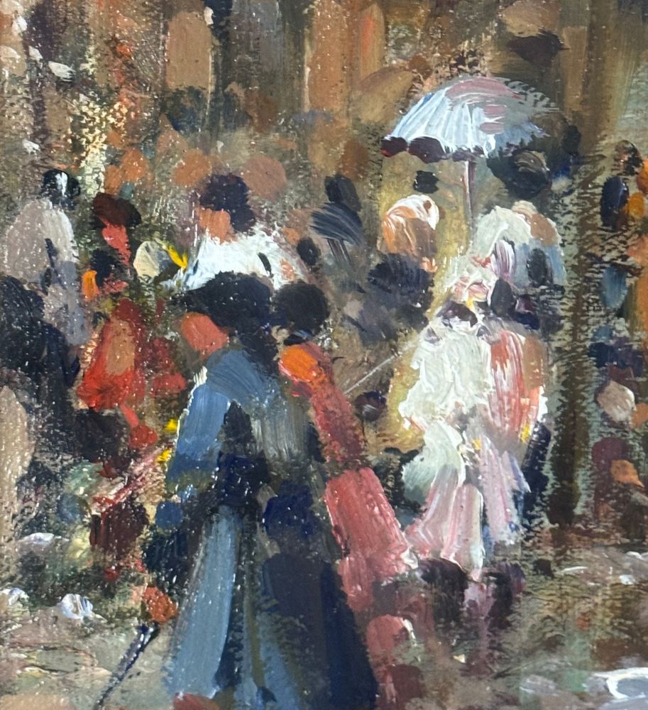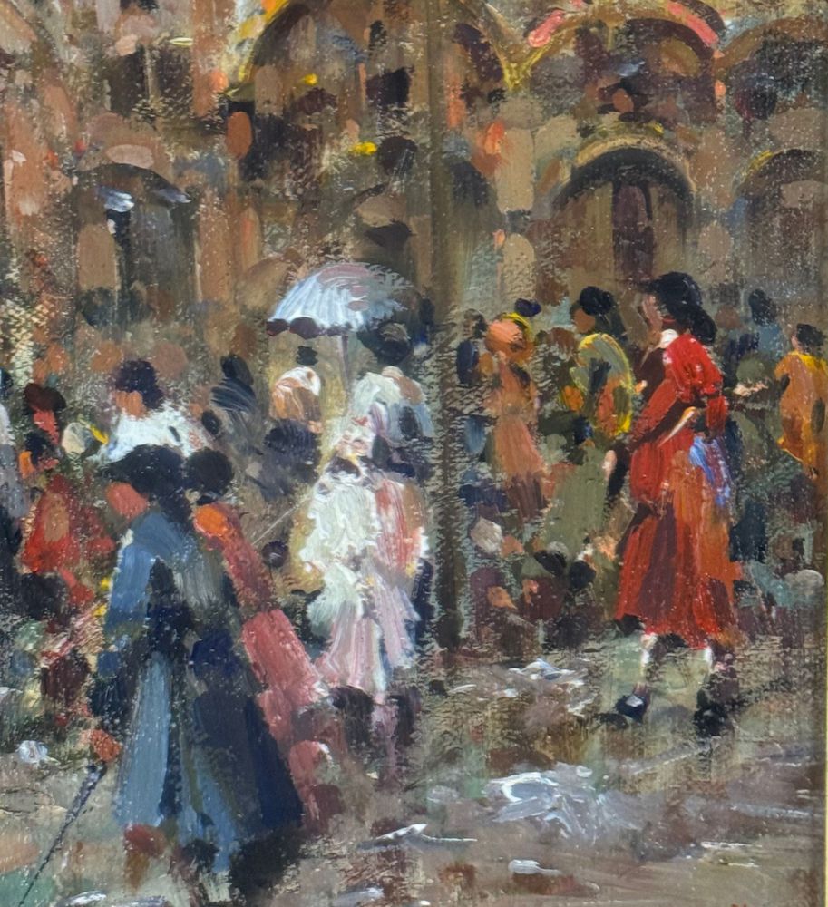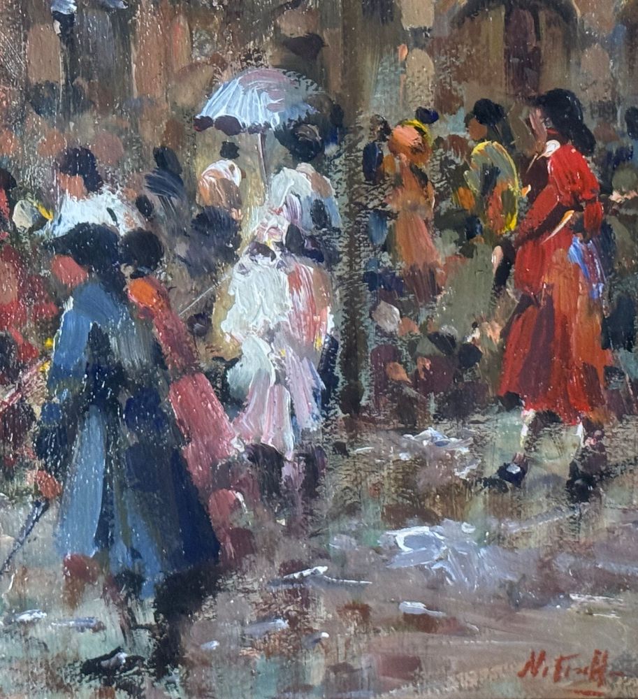 SCUOLA EUROPEA - Dipinto olio su tela, periodo XX secolo, scuola Europea raffigurante Strada con personaggi. Dimensioni compreso cornice: 59x69 cm. Dimensioni interno cornice: 30x40 cm. Firmato in basso a destra artista non identificato. Opera in buone condizioni.