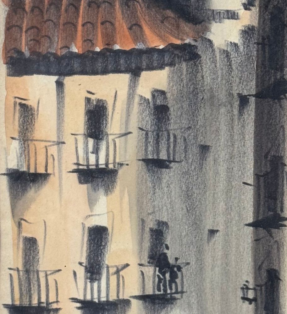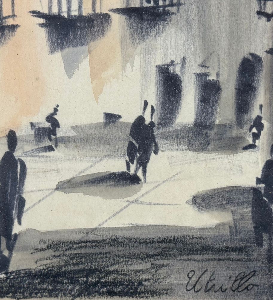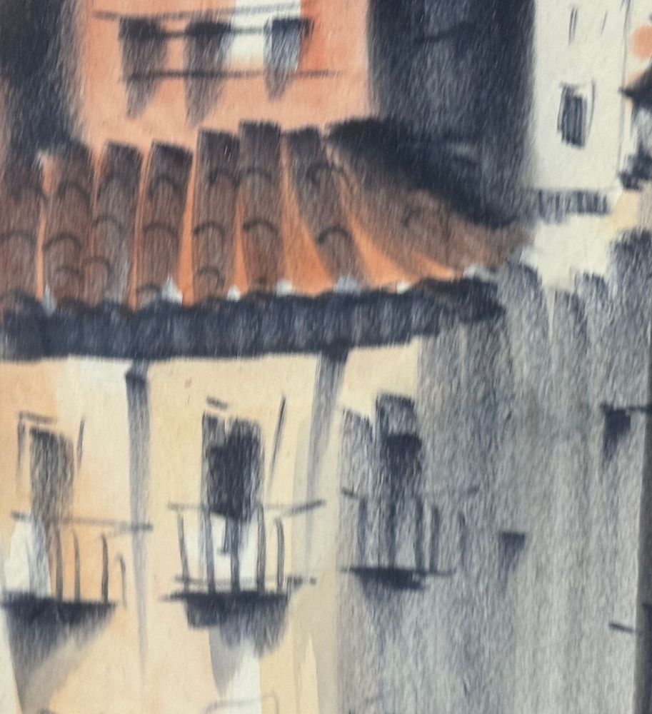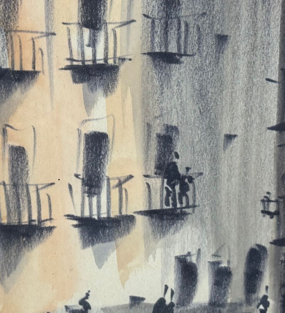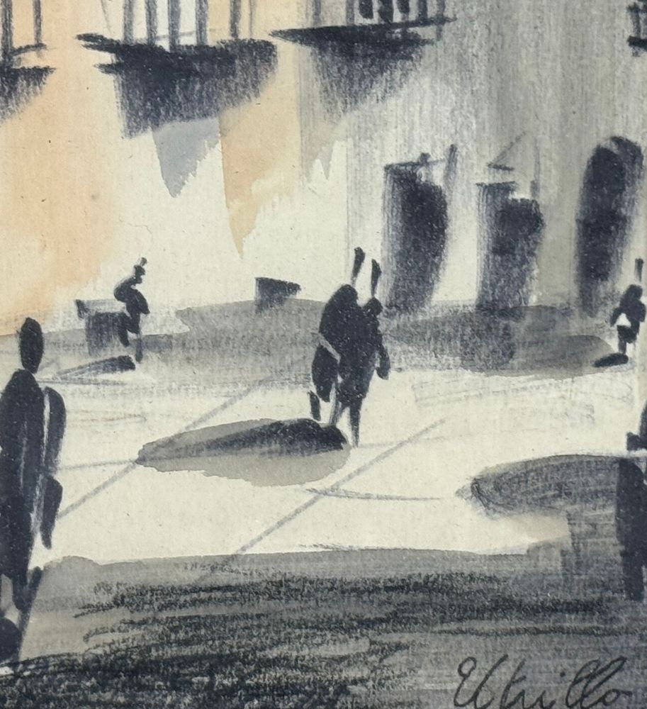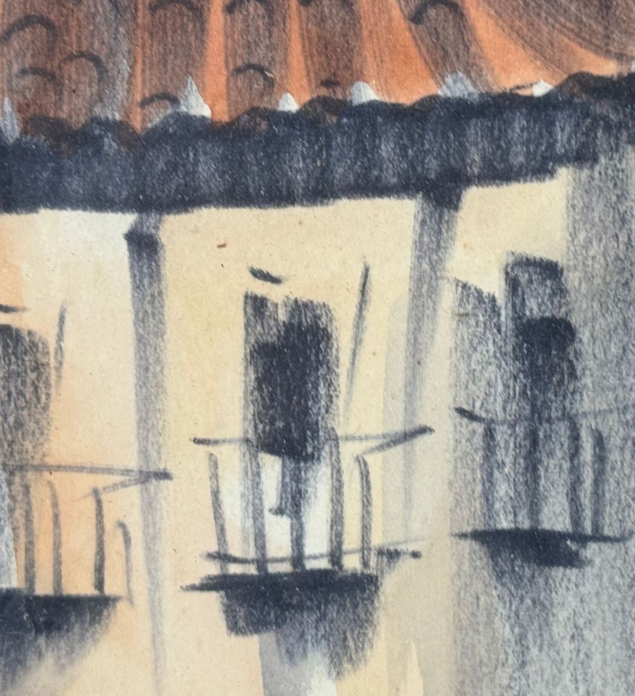 UNIDENTIFIED SIGNATURE - Dipinto acrilico su carta, periodo XX secolo, scuola Italiana raffigurante Stradina con personaggi. Dimensioni compreso cornice: 24x55,5 cm. Dimensioni interno cornice: 15x47 cm. Firmato in basso a destra artista non identificato. Opera in buone condizioni.