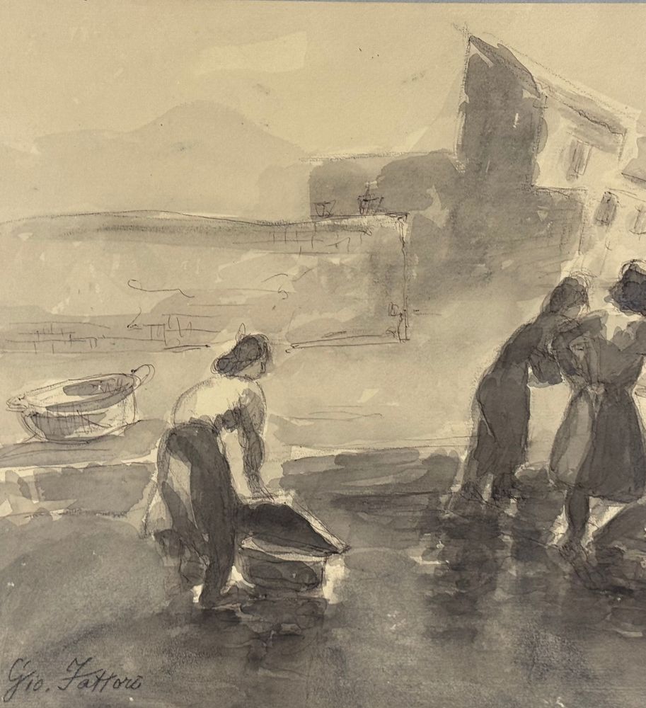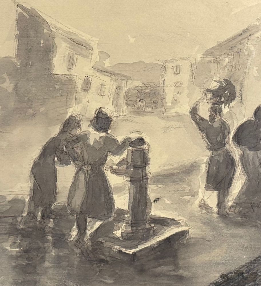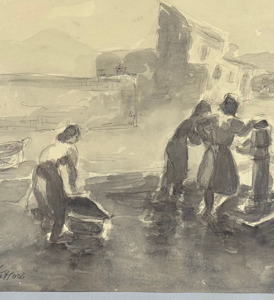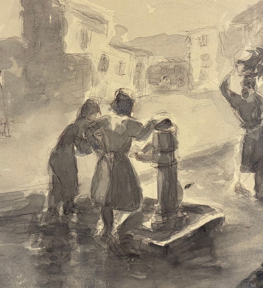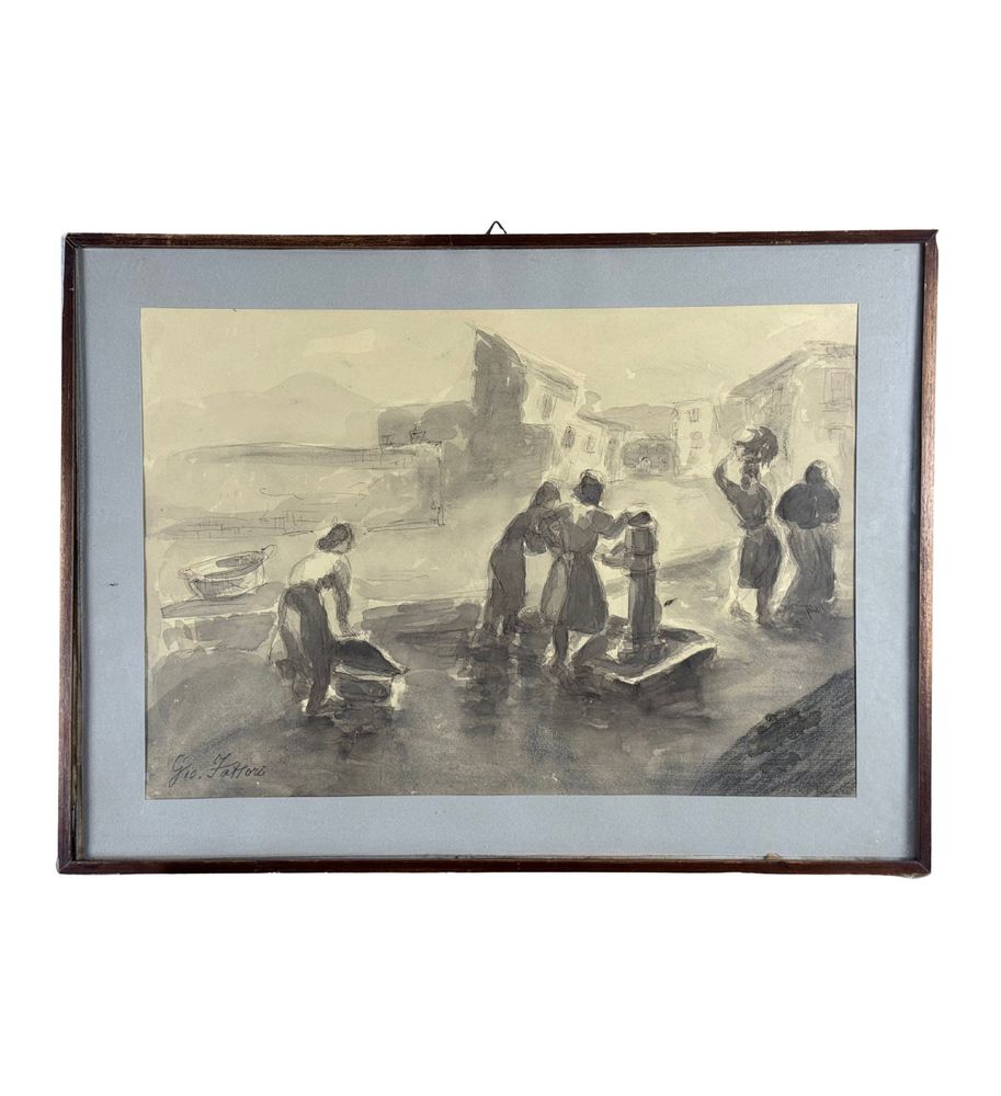 UNIDENTIFIED SIGNATURE - Disegno su carta, periodo XIX/XX secolo, scuola Italiana raffigurante Donne alla fontana. Dimensioni compreso cornice: 58x43 cm. Dimensioni interno cornice: 48x33 cm. Firmato in basso a sinistra artista non identificato. Opera in buone condizioni.