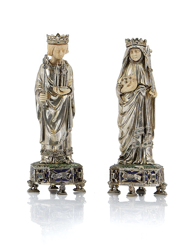 COPPIA DI SCULTURE IN ARGENTO E AVORIO, XIX SECOLO, raffiguranti santa Elisabetta e san Luigi, basi in ottagonali decorate a smalti con qualche sbeccatura.