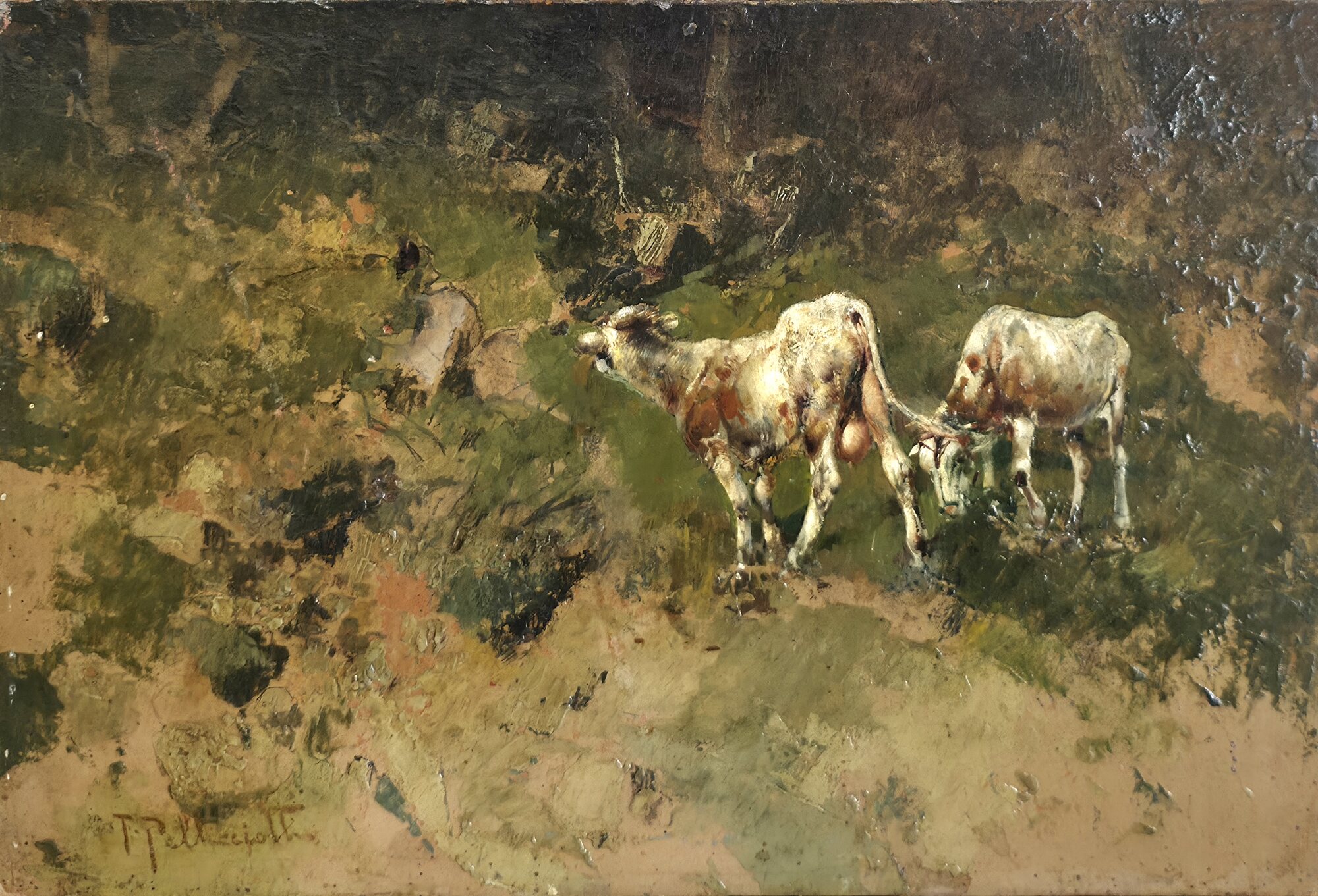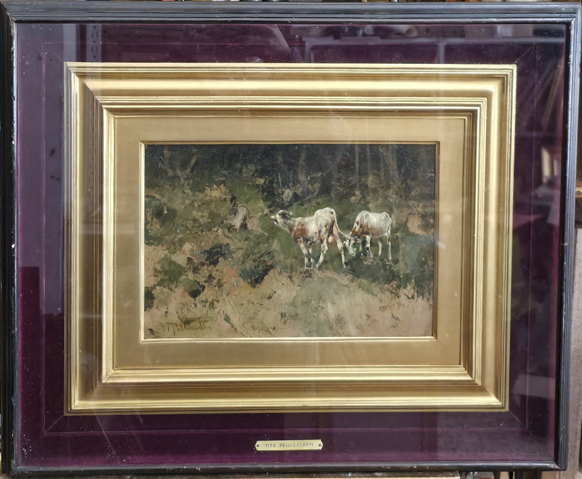 Tito Pellicciotti (Barisciano 1871 – 1950) Mucche al pascolo Misure:cm.123 x 33 senza cornice Misure:cm.32 x 37 con cornice Olio su cartoncino Mucche al pascolo Firma in basso a sx T.Pellicciotti Spedizione Italia € 33 in ottime condizioni