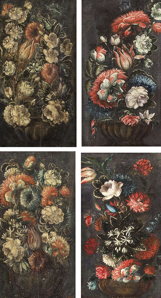 PITTORE DEL XVIII SECOLO Vasi di fiori Quattro oli su tela, cm 50x26,5;...