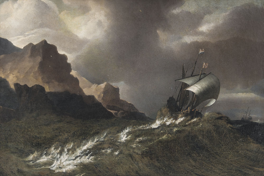 PITTORE OLANDESE DEL XVII SECOLO Marina in burrasca con velieroOlio su tela,...