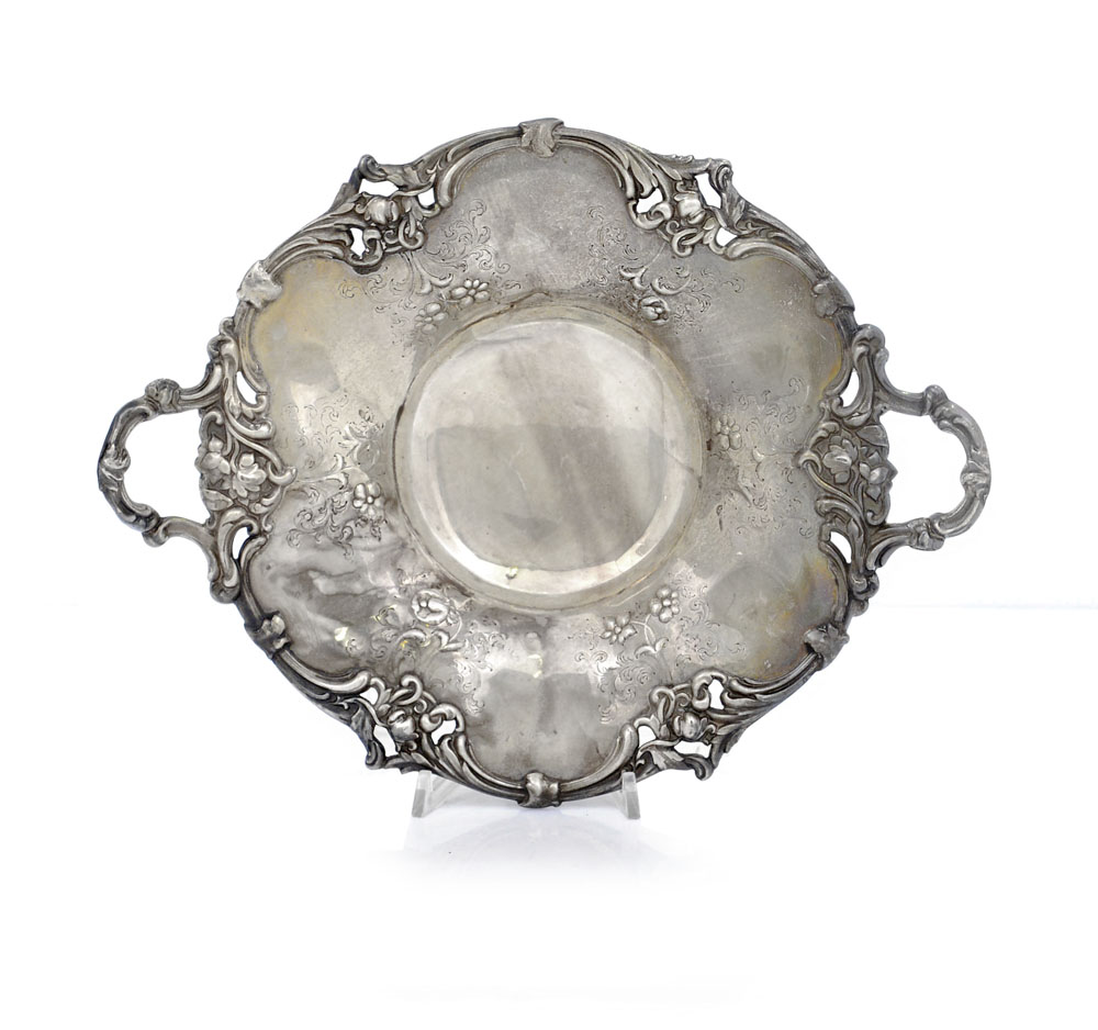 CESTINO VITTORIANO IN ARGENTO, LONDRA, 1862, polilobato con manici su piedini, bordi incisi e traforati.