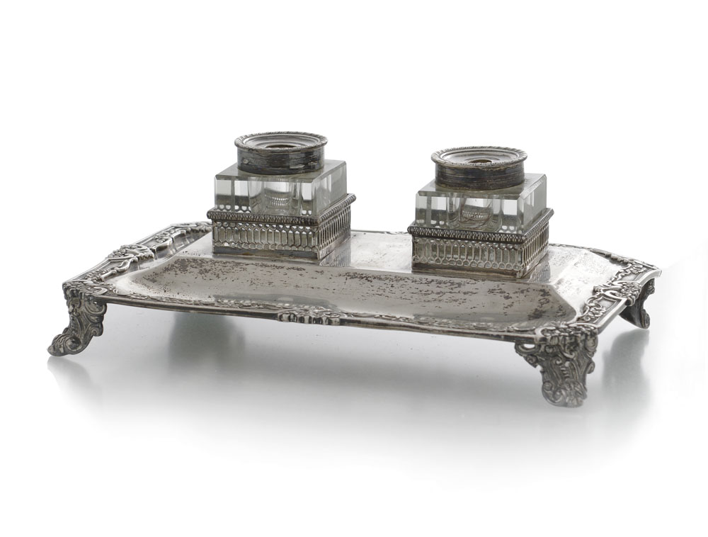 CALAMAIO IN ARGENTO, USA, INIZIO XX SECOLO, con doppio falcone in cristallo, bordo e piedi decorati da fiori.