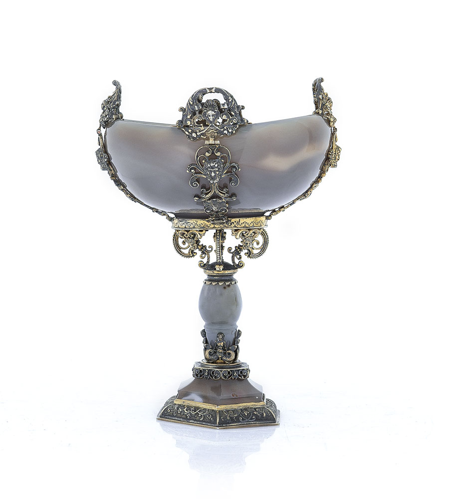 COPPA IN AGATA CON MONTATURA IN ARGENTO E VERMEIL, XIX SECOLO, fusto su base sfaccettata con coppa liscia, montatura a fasce con mascheroni e volute; lievi difetti.