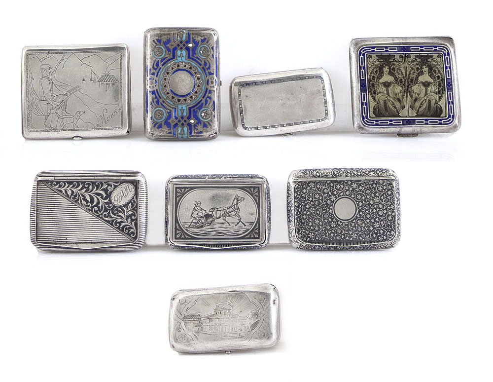 OTTO TABACCHIERE E PORTASIGARETTE IN ARGENTO, XIX-XX SECOLO, decori differenti tra cui alcuni a niello, smalti e incisi a figure; difetti e ammaccature.