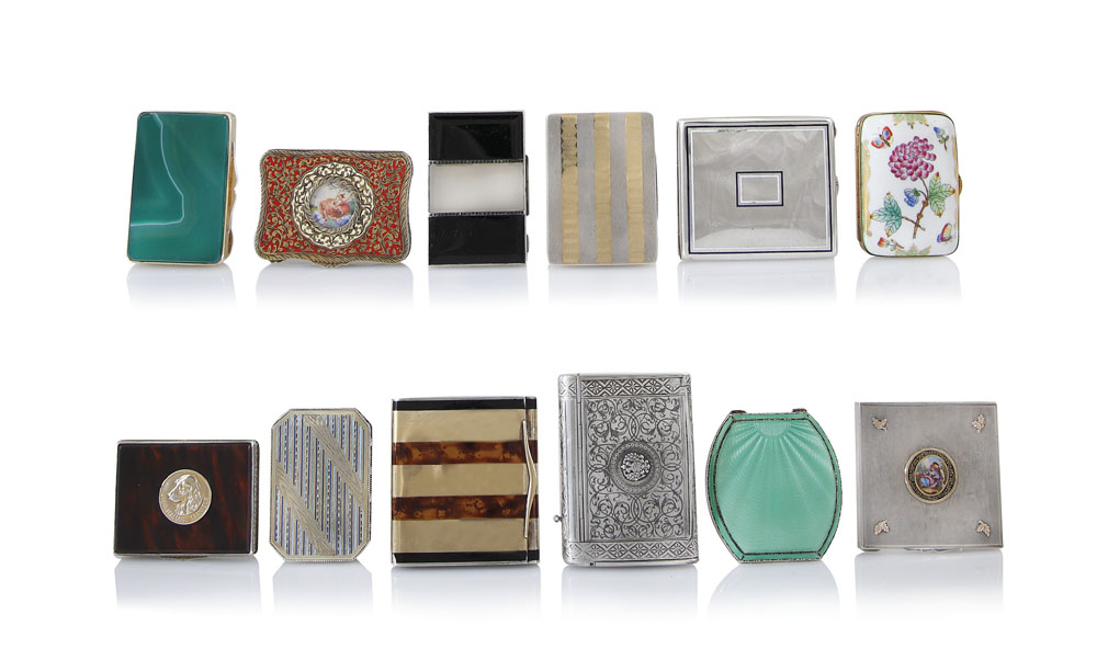 UNDICI TABACCHIERE E PORTASIGARETTE IN ARGENTO E UNO IN PORCELLANA, XIX-XX SECOLO, di varie fogge con decori differenti a smalti con figure e guilloché, applicazioni in pietre dure e altri materiali; difetti e usure.