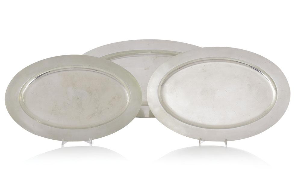 UNA PESCIERA E DUE VASSOI OVALI IN ARGENTO, XX SECOLO, lisci; qualche graffio.