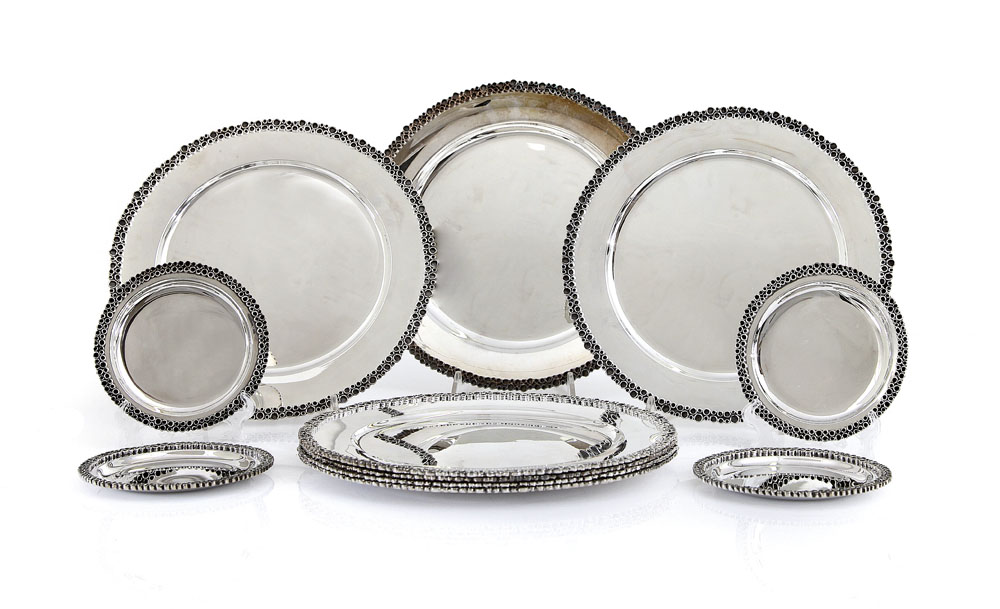 SEI SOTTOPIATTI, QUATTRO SOTTO BOTTIGLIA E UN PIATTO IN ARGENTO, XX SECOLO, bordi ad ovoli irregolari.