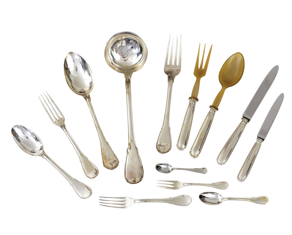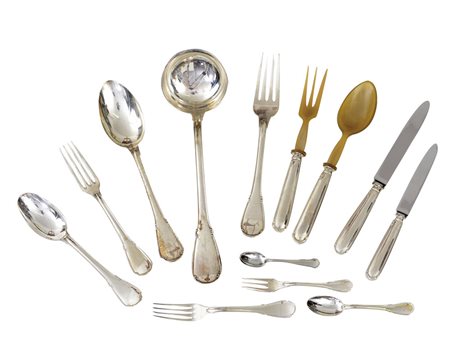 SERVIZIO DI POSATE IN ARGENTO, ALESSANDRIA, CESA, XX SECOLO, composto da dodici forchette, cucchiai e coltelli, dodici forchette e coltelli da frutta, dodici forchettine da dessert, undici cucchiaini da tè e dodici da caffè, un mestolo e quattro posate da portata, entro cofanetto. (tot pz. 100)