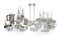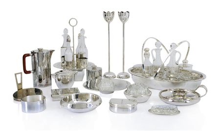 LOTTO DI DIVERSI OGGETTI IN ARGENTO, XX SECOLO, composto da due candelieri a fiore (zavorrati) entro cofanetto, un set da tavola con elementi in vetro e ampolle (mancante di alcuni elementi), due piccole fioriere in cristallo e argento, una caffettiera e zuccheriera con coperchio, una bugia, una formaggiera, una ciotola, un portabiglietti a libro, una ciotola con coperchio, una spazzola raccoglibriciole, un'oliera con sale e pepe e un portastuzzicadenti in cristallo con piattino in argento; difetti e usure.