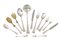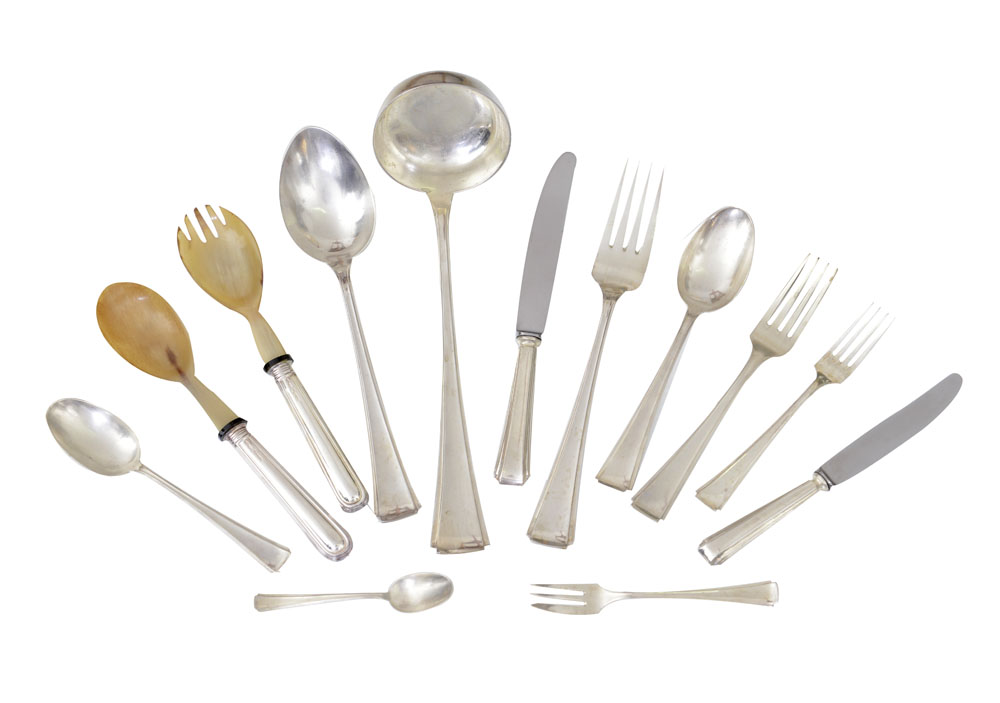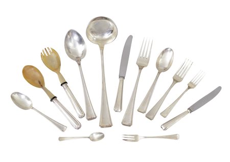 SERVIZIO DI POSATE IN ARGENTO, XX SECOLO, composto da otto forchette, cucchiai e coltelli, otto forchette, cucchiai e coltelli da frutta, otto forchettine da dessert, otto cucchiaini da caffè e sette da tè, un mestolo e quattro posate da portata. (tot. pz 75)