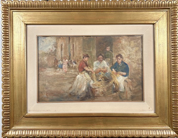 Cesare Ciani "Il vaglio del grano" olio su cartone (cm 25x40) firmato in basso